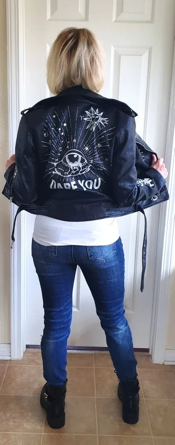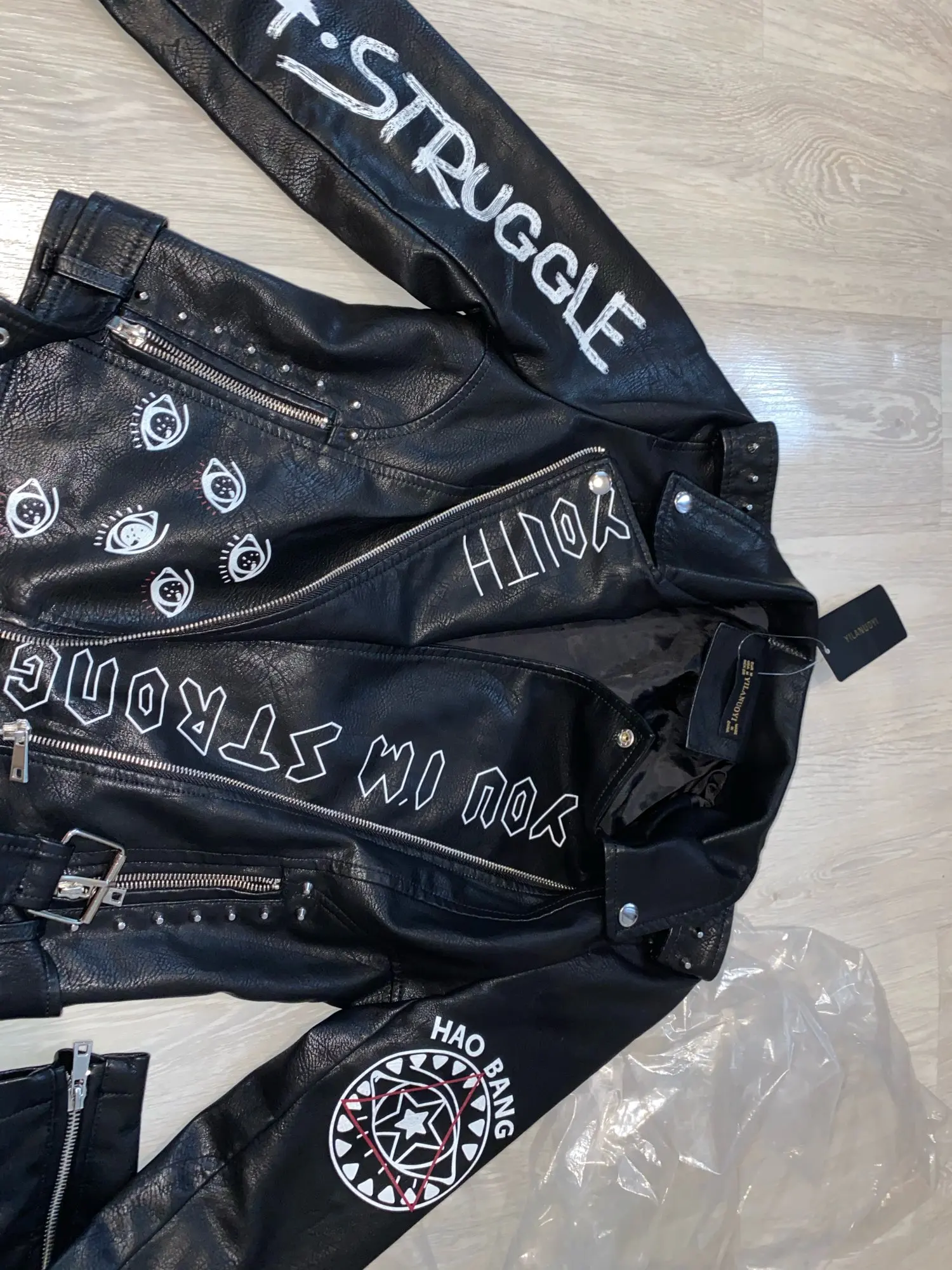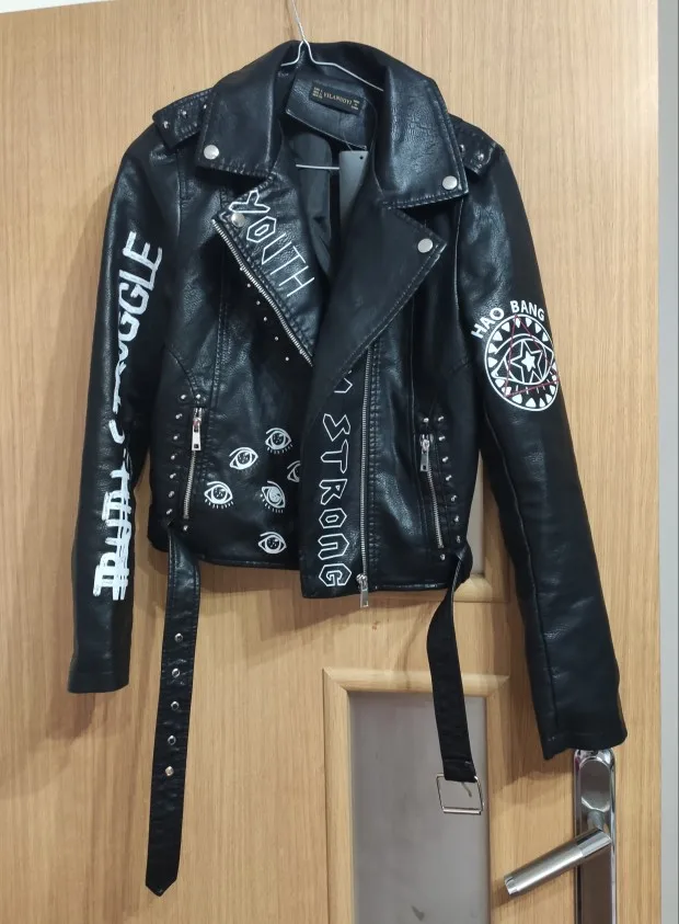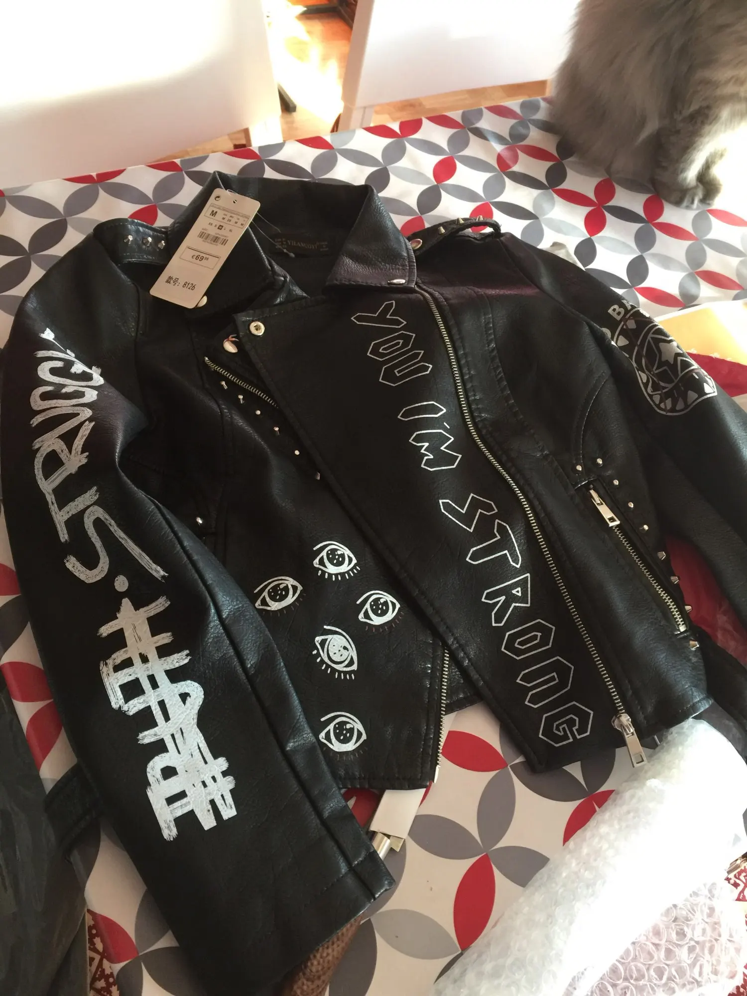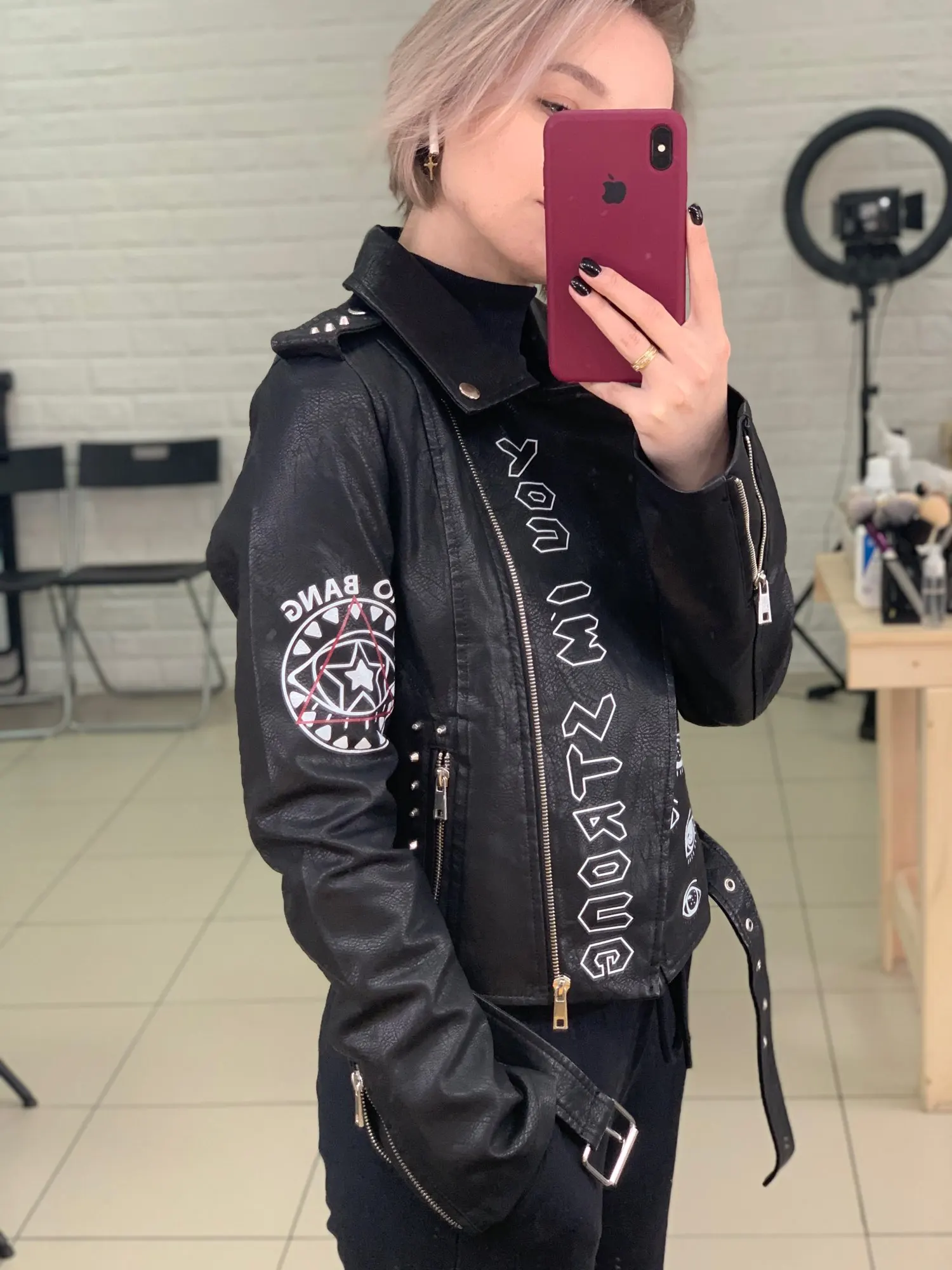 Куртка женская осенне-зимняя из искусственной мягкой кожи, черная, с заклепками, на молнии, с 3D-принтом, мотоциклетная уличная одежда, 2021