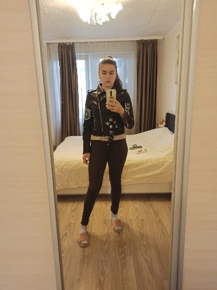 Куртка отличная,но на настоящую кожу конечно не похожа. Я люблю когда куртка сидит в обтяжку,и смотрится аккуратненько Поэтому S, на мои 53кг и 168 см,сидит идеально,был бы размер Xs, взяла бы его
