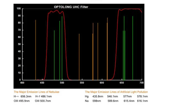 Астрономические фильтры Optolong проверяются спектрофотометром Shimadzu, чтобы гарантировать наиболее точные Спектральные характеристики, чтобы сделать ваше фотографическое изображение более четким и ярким. Лучше всего подходит для визуальных наблюдений, фильтр UHC (ультра высокая контрастность) помогает увеличить Контрастность объектов глубокого неба, блокируя уличные фонари и воздушные свечения. Фильтр работает, блокируя длины волн или ртуть и натрий-пары, используемые в городском освещении, позволяя видимым и Н-Альфа излучений через. Фильтр UHC позволяет O-III и H бета-линиям проходить и через блокирование фона неба, это помогает выводить детали и контрастировать с планетарными и газовыми туманностями.