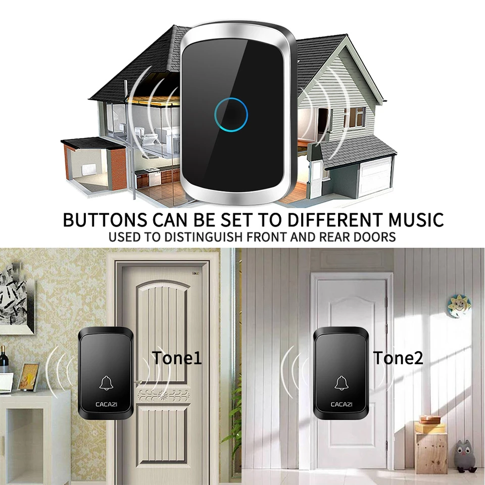 Беспроводной дверной звонок 300 м с дистанционным управлением, 2 кнопки, 6 приемников, водонепроницаемый, умный, светодиодный, домашний, дверной звонок, беспроводной, 58 колокольчиков