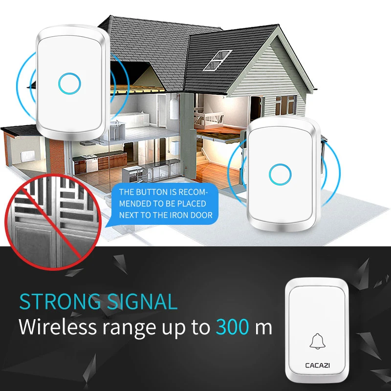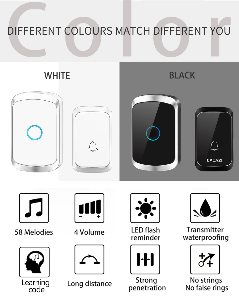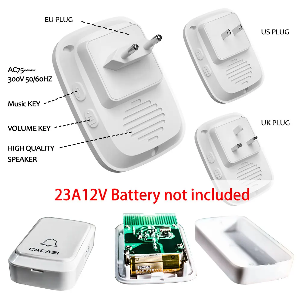 1. Нажмите кнопку, супер код обучения может свободно узнать, чтобы соответствовать, может быть неограниченное соответствие приемника. 2. Передатчик без винтового патрона для достижения водонепроницаемости и пыленепроницаемости. 3. Если несколько кнопок сопряжены с одним или несколькими приемниками в одной системе, каждая кнопка может быть настроена на другой мелодию звонка. 4. Функция отключения питания: Включите питание снова после выключения питания, нет необходимости повторно регулировать и блокировать мелодию звонка. 5. Кнопка дверного звонка использует батарею 23A12V (не входит в комплект) и напряжение приемника составляет 220 В. 6. Приемник доступен в различных вилках, США/ЕС/Великобритании Вилка и AU адаптеры, подходит для большинства стран. 7. Расстояние приема: 300 м на открытой местности. 8. На беспроводной сигнал будут влиять препятствия. Чем больше препятствий, тем тяжелее потеря сигнала. 9. Приемник имеет 58 мелодий звонка на выбор, и громкость составляет 20-80 дБ в 4 уровней. 10. Размер передатчика: 77*46*20 мм 11. Размер приемника: 95*56*20 мм 12. Просто подключите приемник к электрической розетке, кнопочный передатчик может приклеить его к двери с помощью предоставленных клейких лент. Примечание: Кнопка не может быть размещена на железной двери, потому что это будет мешать сигналу. Если приемник не звонит при нажатии на кнопку после получения дверного звонка, проверьте действия: 1. Кнопка должна быть оснащена щелочной батареей 23A12V. 2. Пожалуйста, повторно подключите дверной звонок.