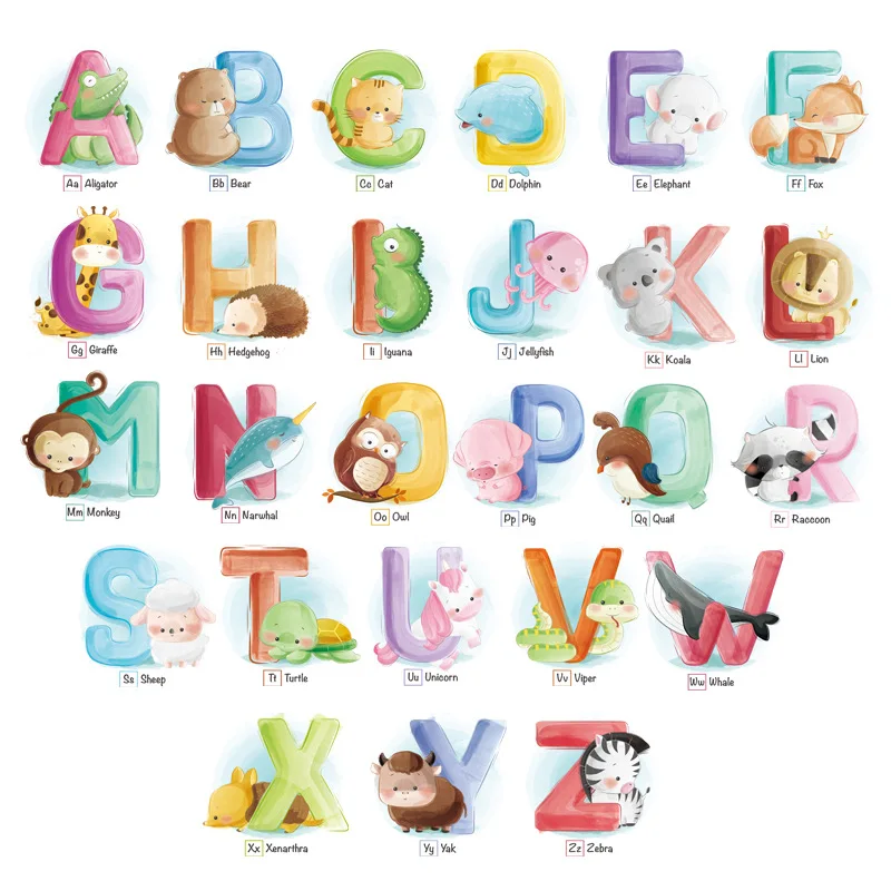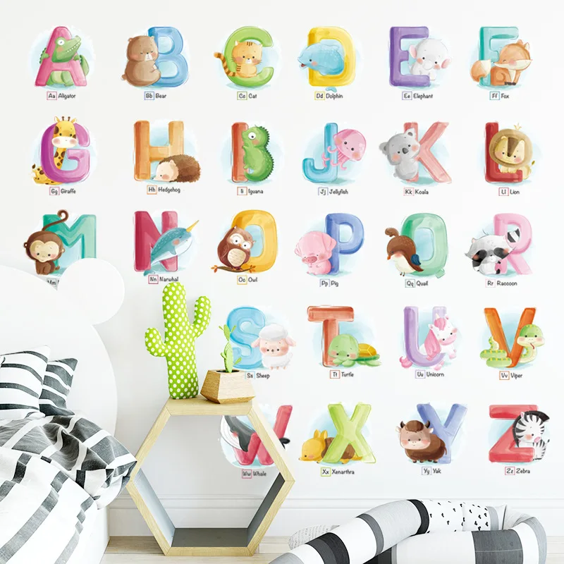 Виниловые наклейки на стену, с изображением животных, 26 букв, для спальни, детского сада, раннего развития