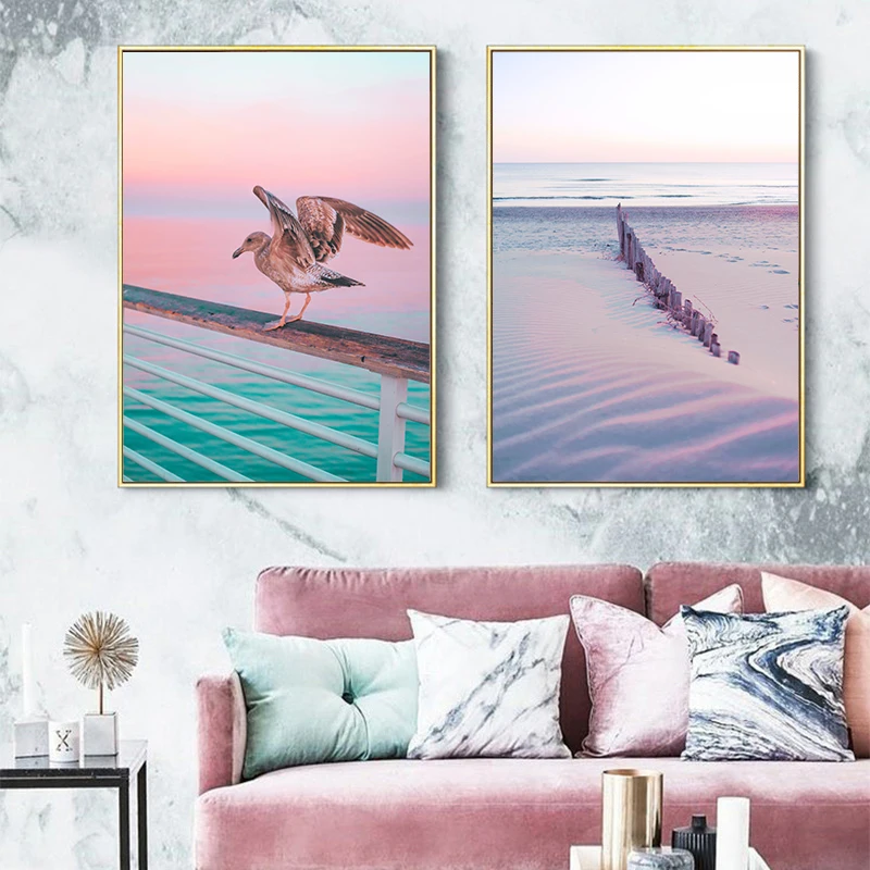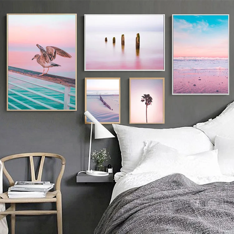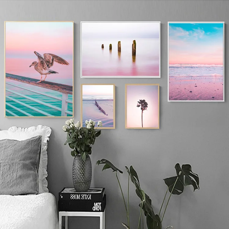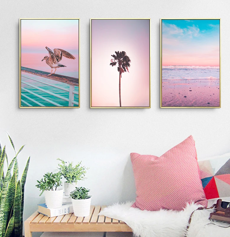 Розовый Фиолетовый Пляж океан холст постер печать Восход кокосовый пейзаж художественная Живопись морской пейзаж Картина настенное украшение