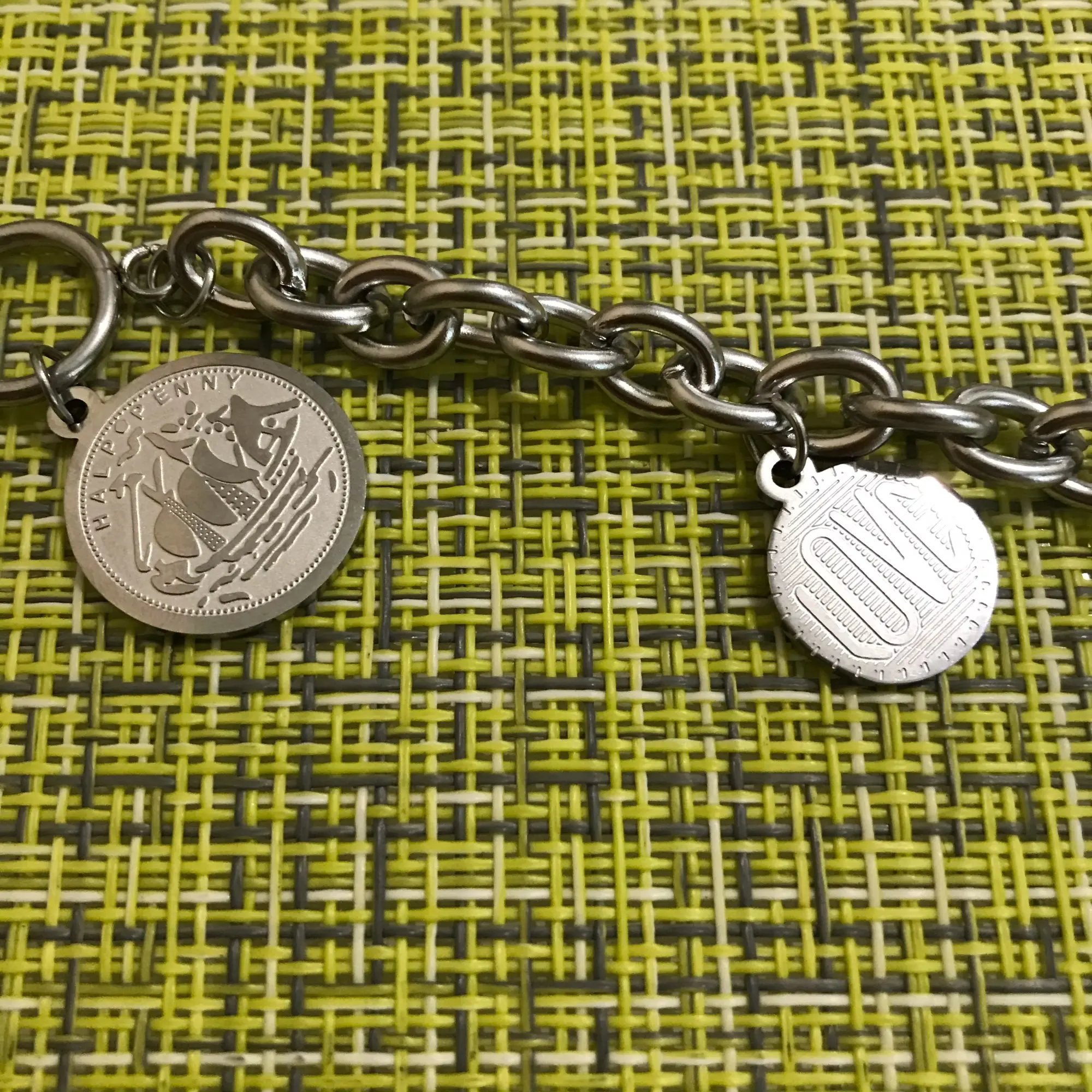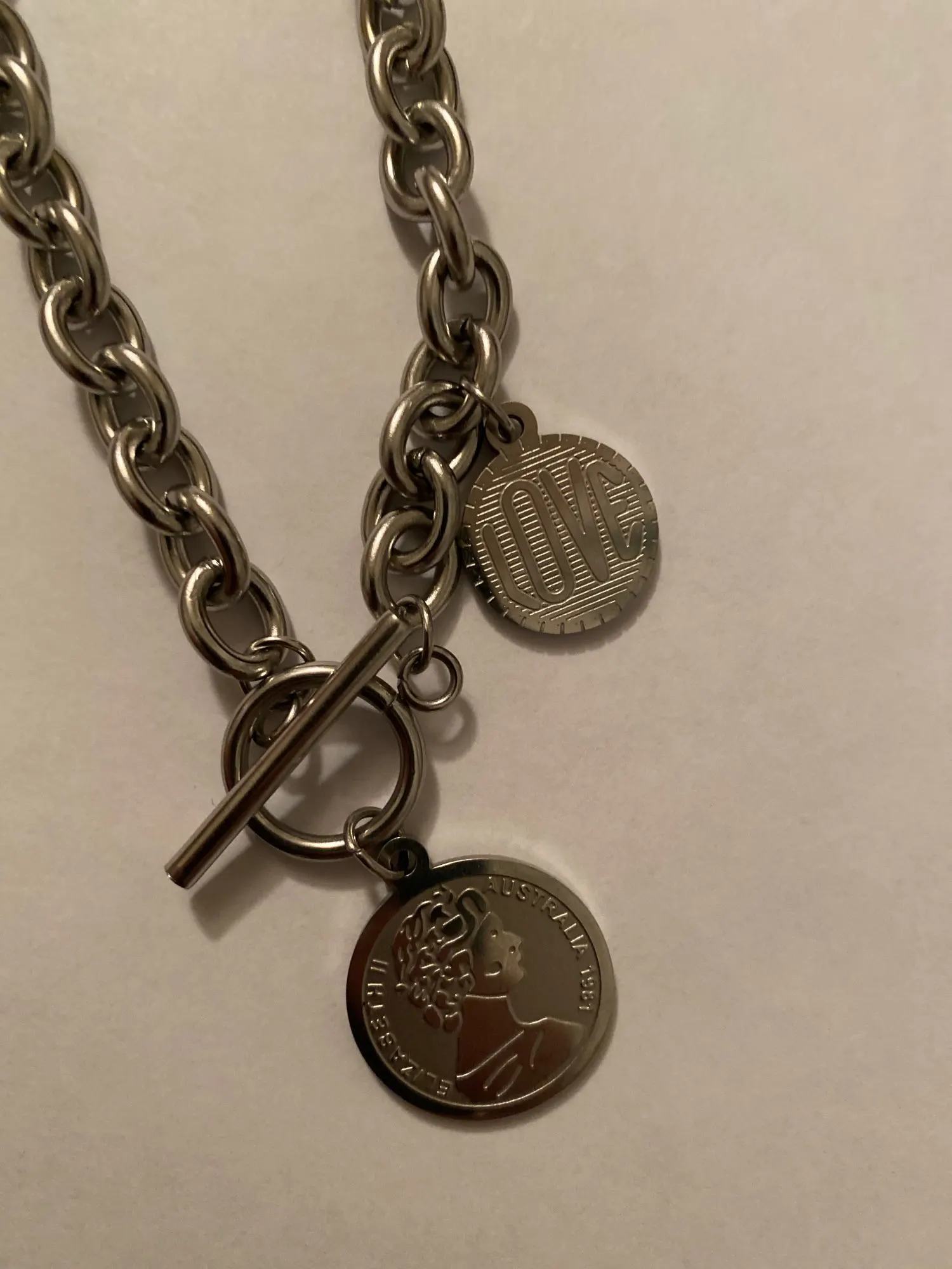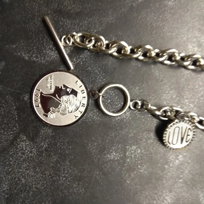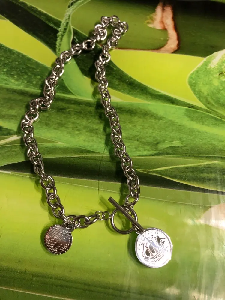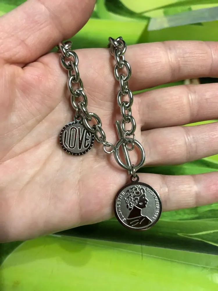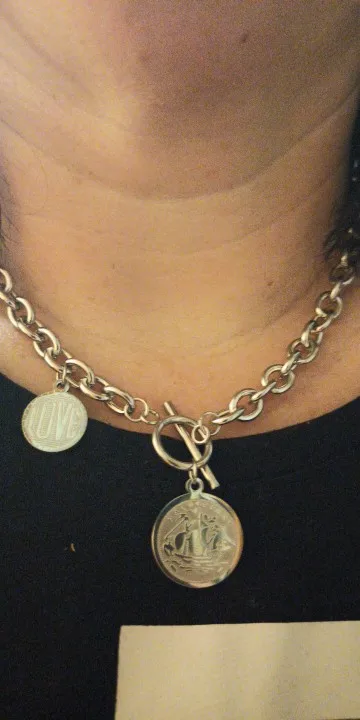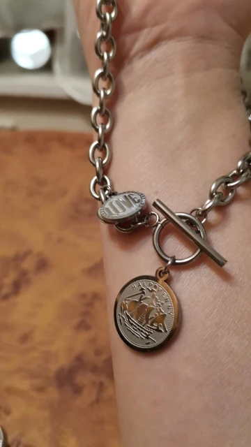 Мне нравится! Он тяжелый, надеюсь, это действительно сталь, поэтому он не будет переворачиваться черным или ржавым, монеты тяжелые, хорошо сделаны, и вся работа имеет эклектическое ощущение гранж (цепь) С нежным прикосновением (монеты).