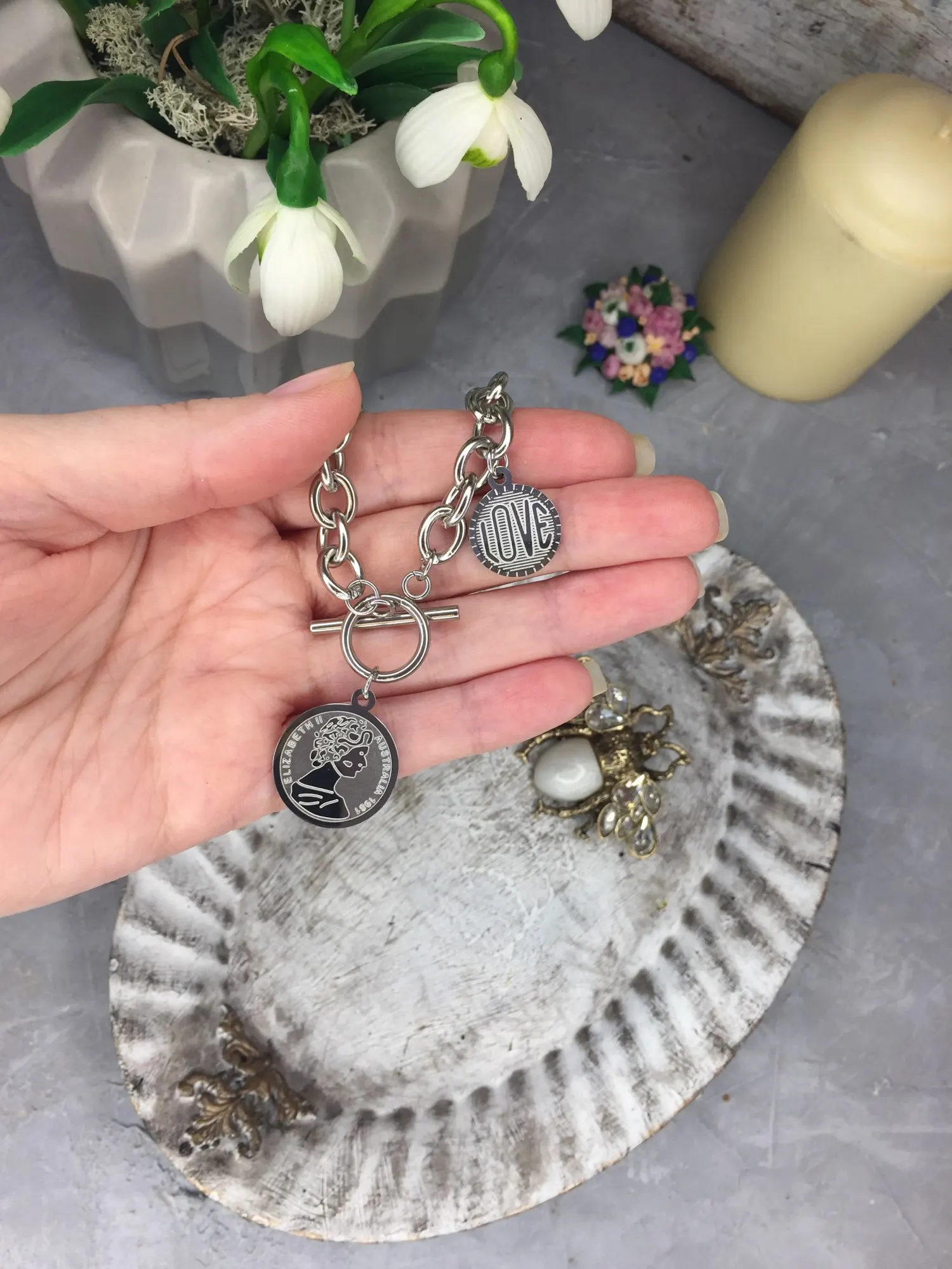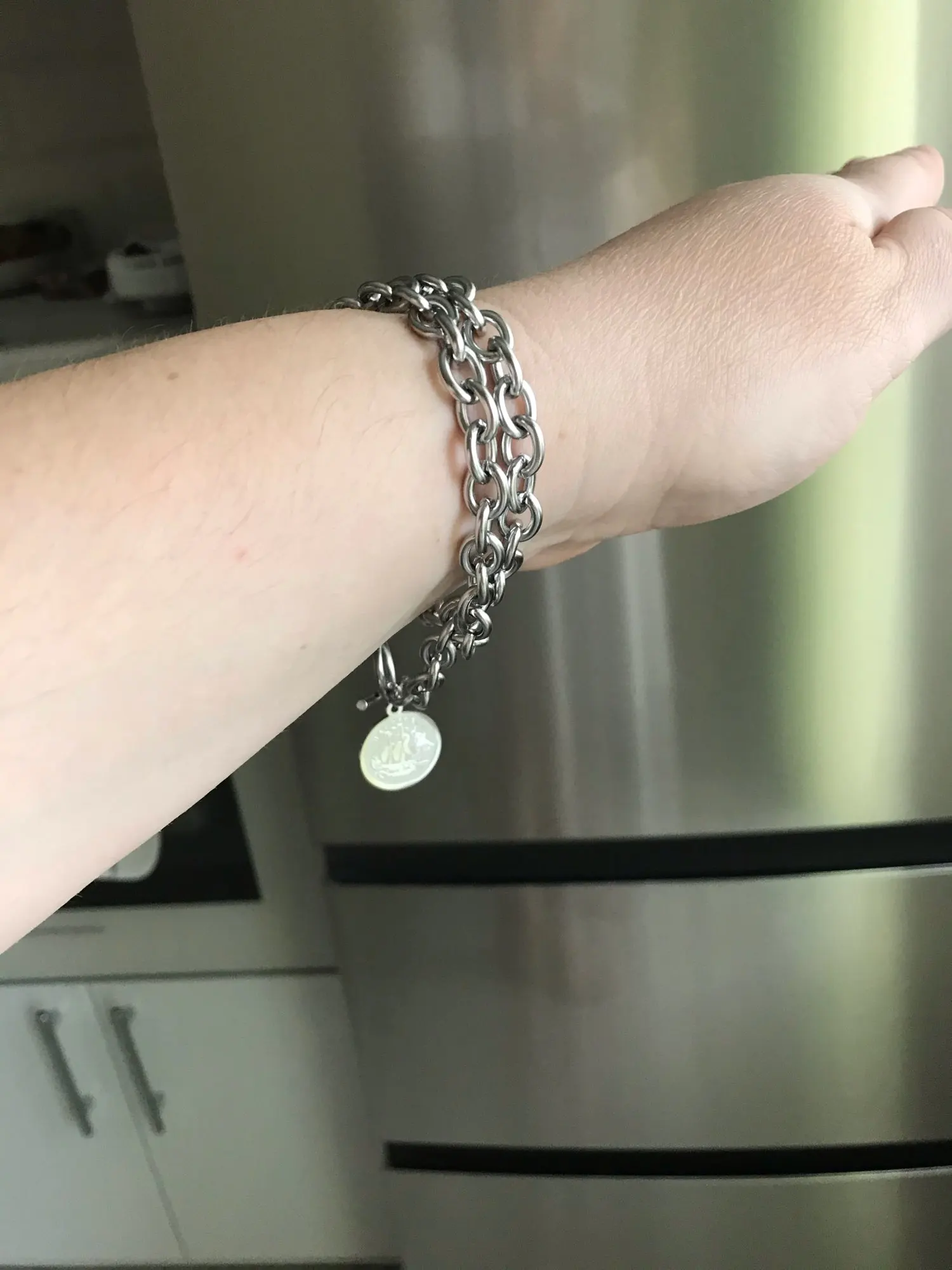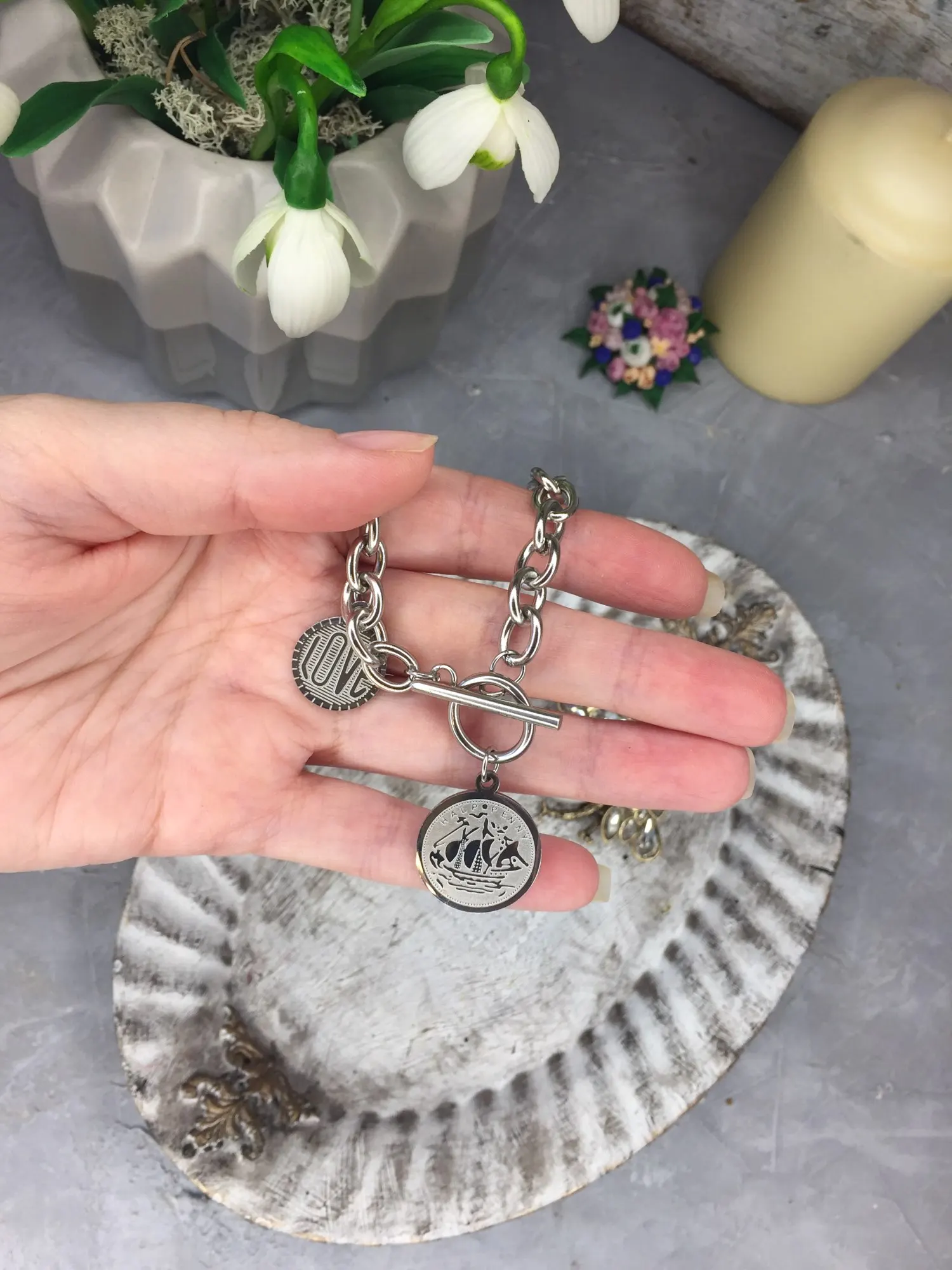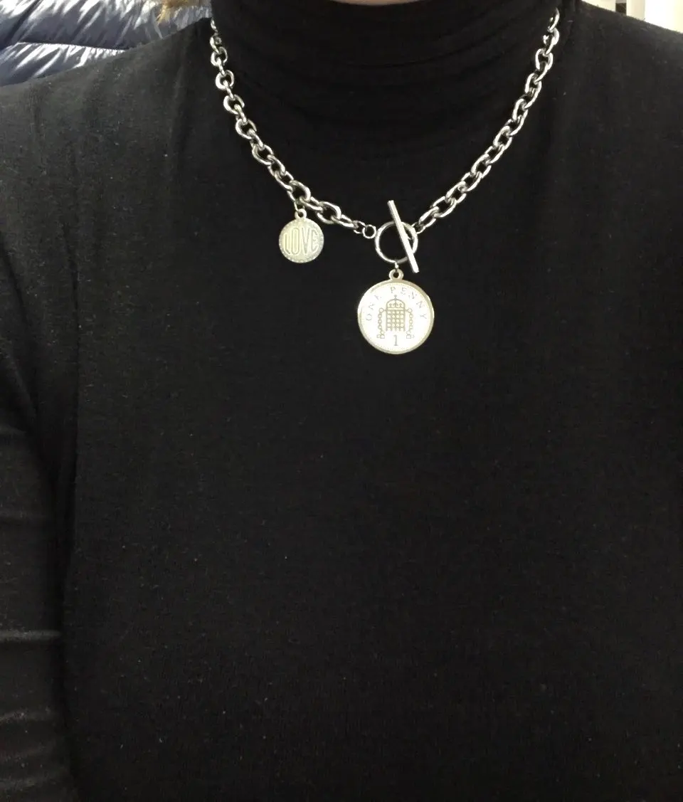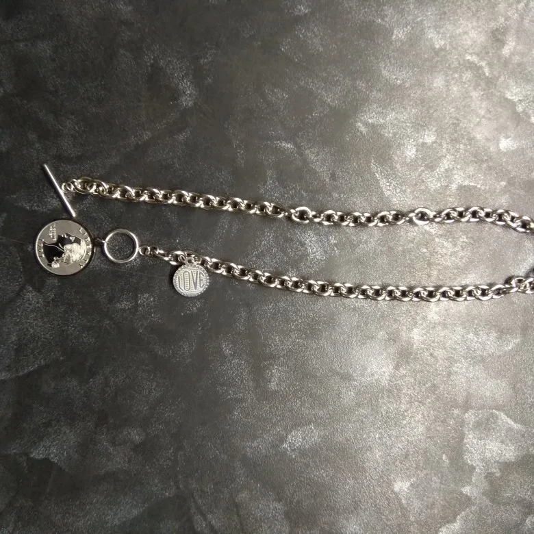 Мне нравится! Он тяжелый, надеюсь, это действительно сталь, поэтому он не будет переворачиваться черным или ржавым, монеты тяжелые, хорошо сделаны, и вся работа имеет эклектическое ощущение гранж (цепь) С нежным прикосновением (монеты).