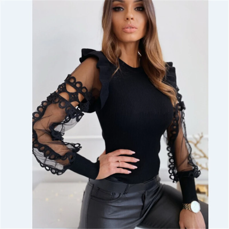 Новинка, Модный женский весенне-осенний прозрачный сетчатый цветочный свитер с оборками и длинным рукавом, повседневный облегающий свитер, топы, вязаный теплый пуловер, топы