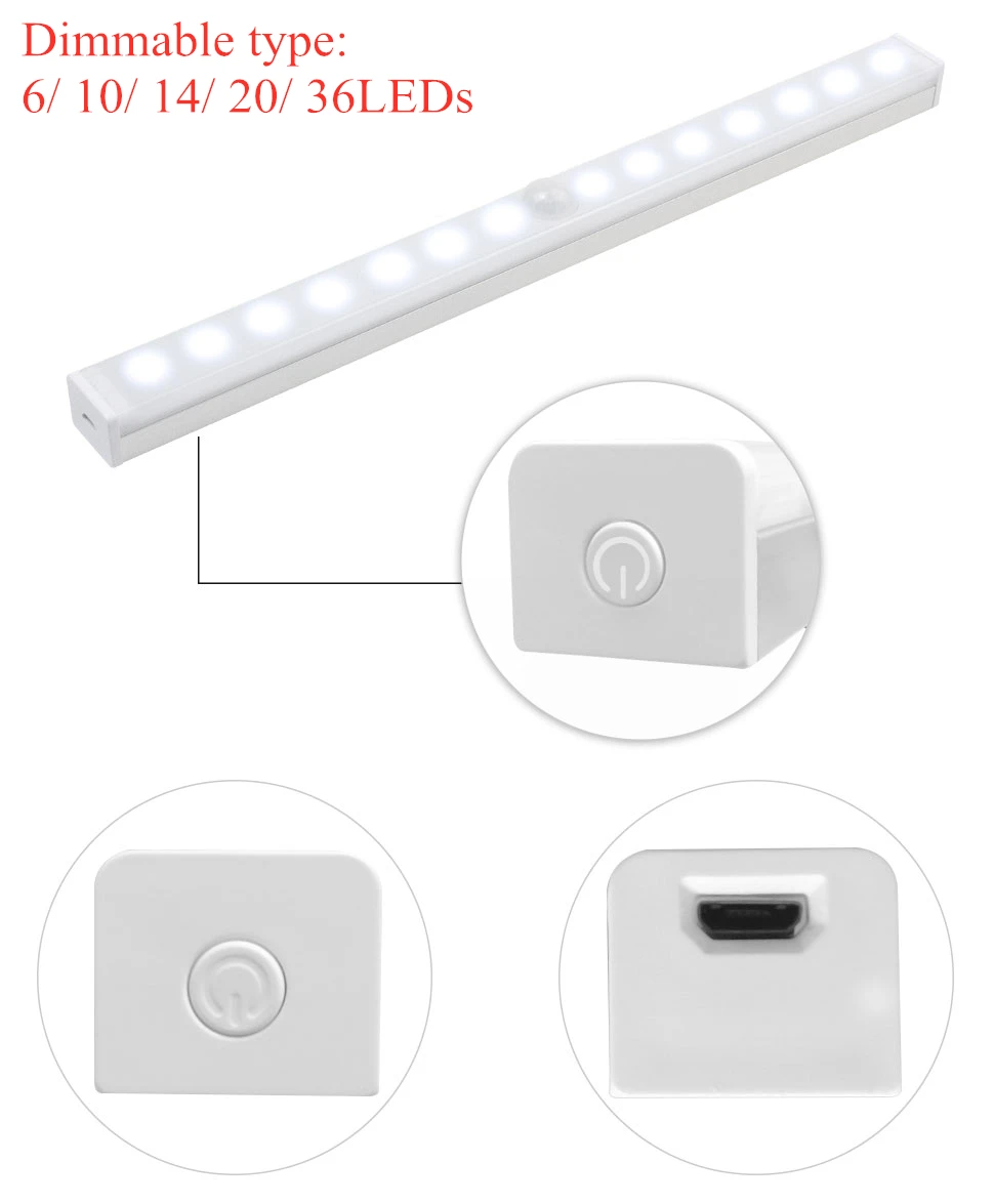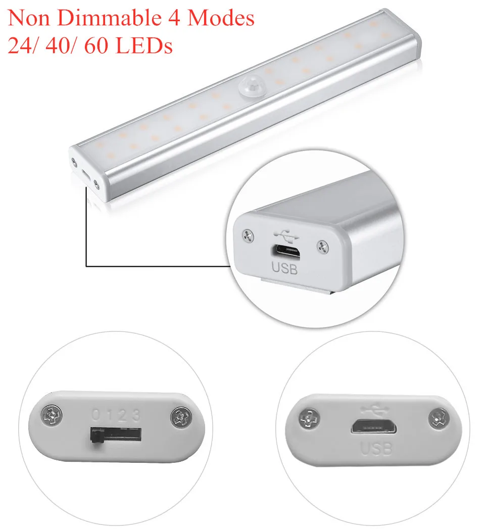Регулируемый светильник для шкафа, 610142036 светодиодов, 244060 светодиодов, 4 режима, Пассивный инфракрасный датчик движения, ночсветильник, USB, перезаряжаемый, для спальни, гардероба