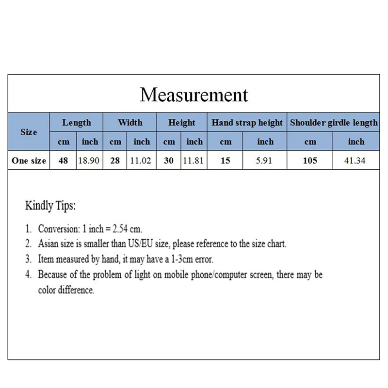 Размер: примерно 48 см в длину, примерно 28 см в ширину и примерно 30 см в высоту. Высота ремешка примерно 15 см. Плечевой ремень длиной примерно 105 см. Ошибка примерно 3см.