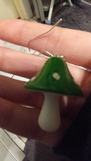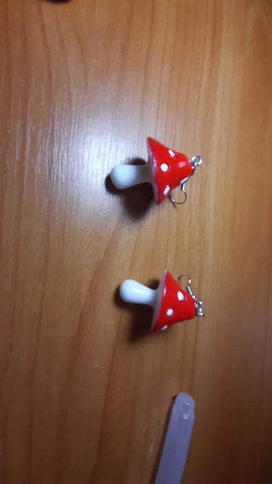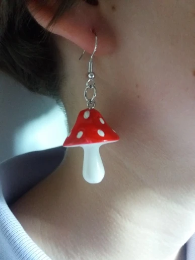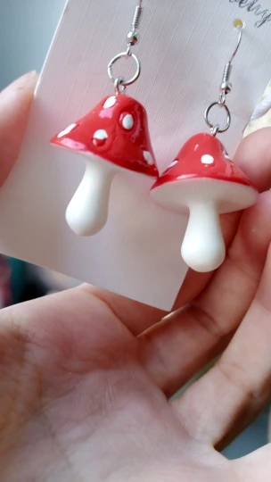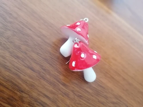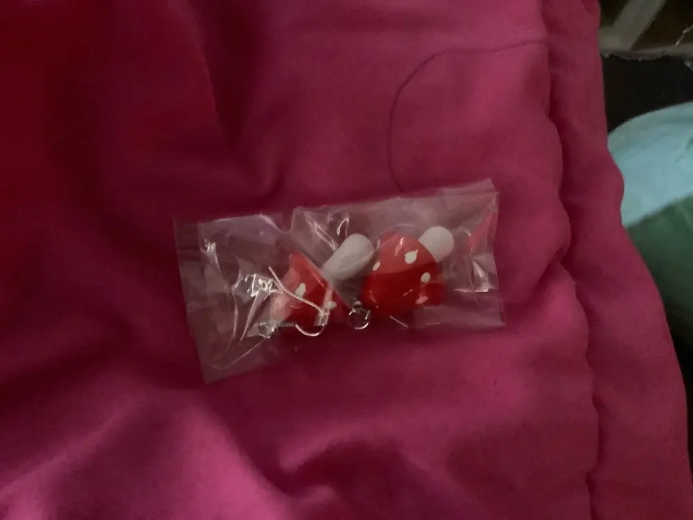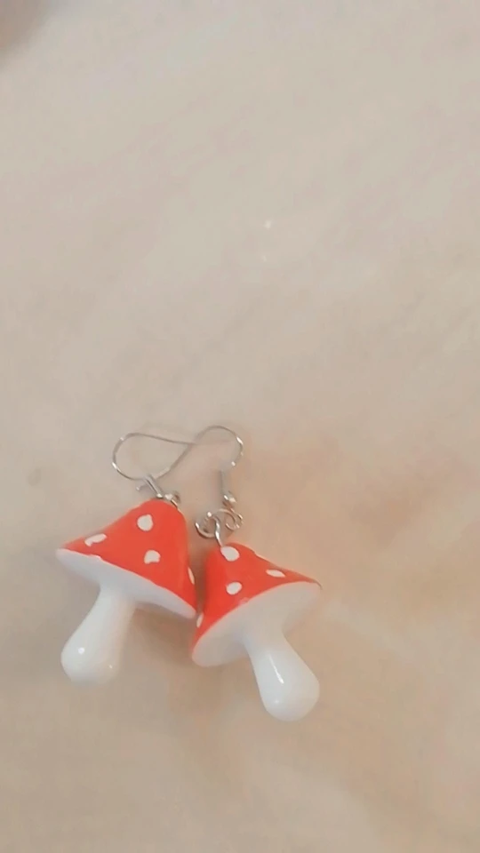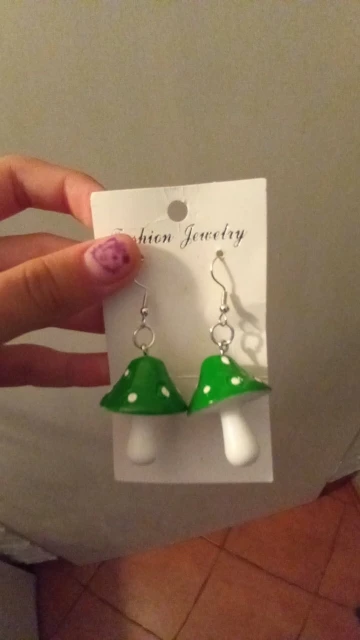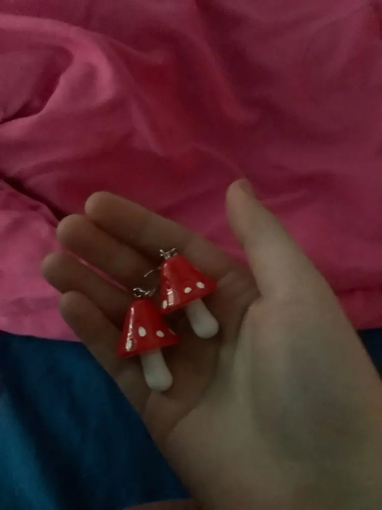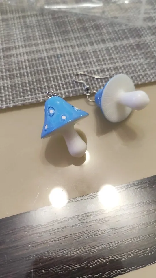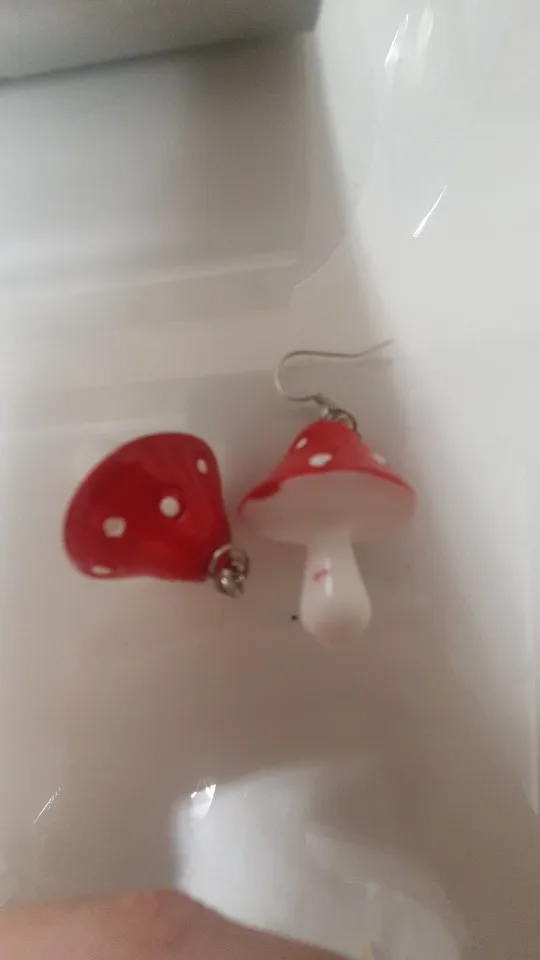 сережки очень красивые не тяжелые точечки немного сдвинуты но это не бросается в глаза все пришло в хорошем состоянии по размеру отлично, единственное это то что когда сережка упала отломалась ножка у грибочка