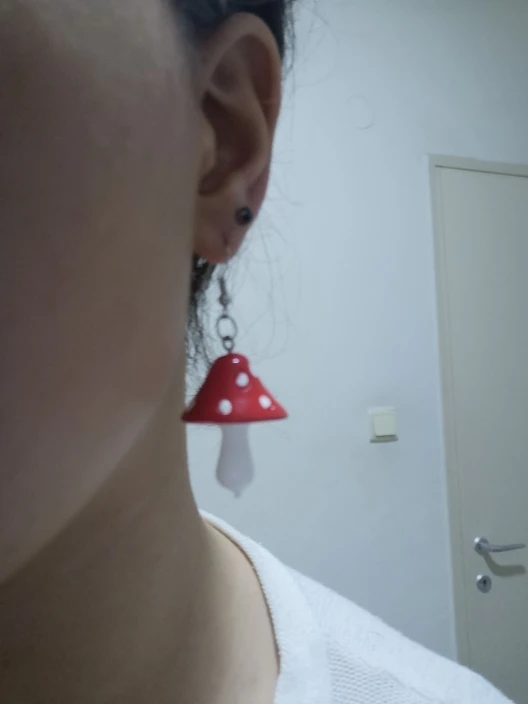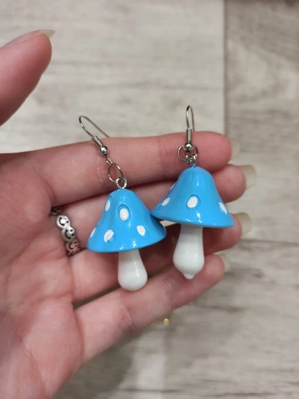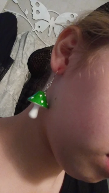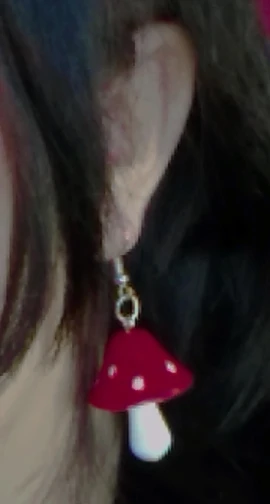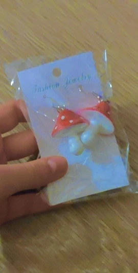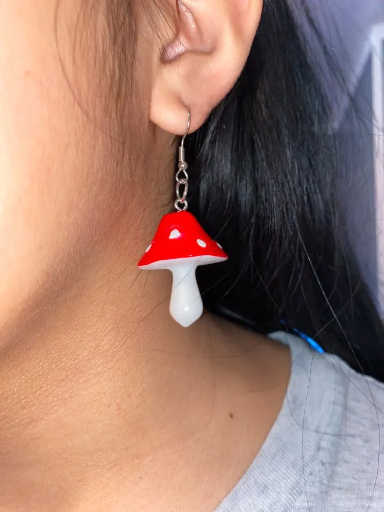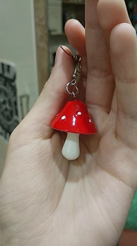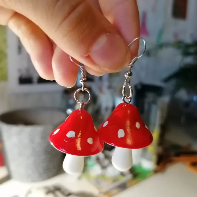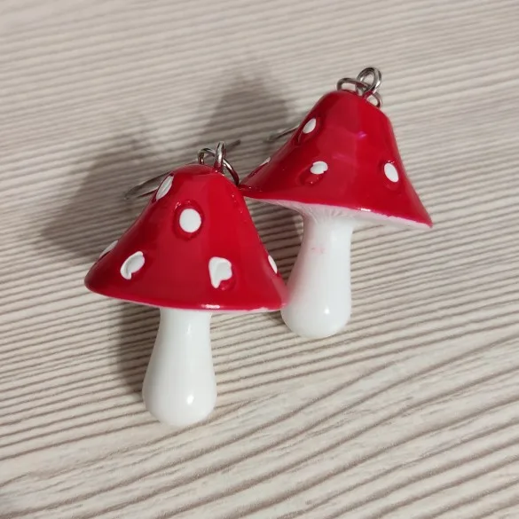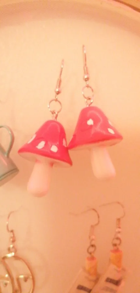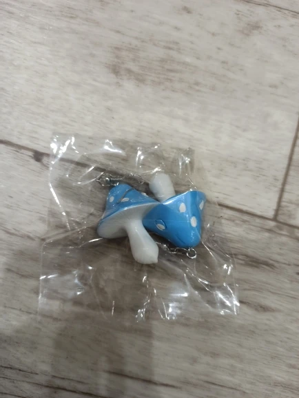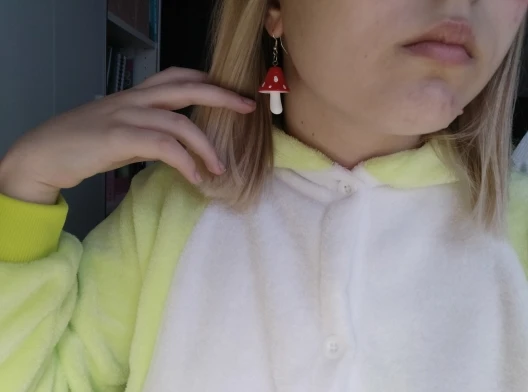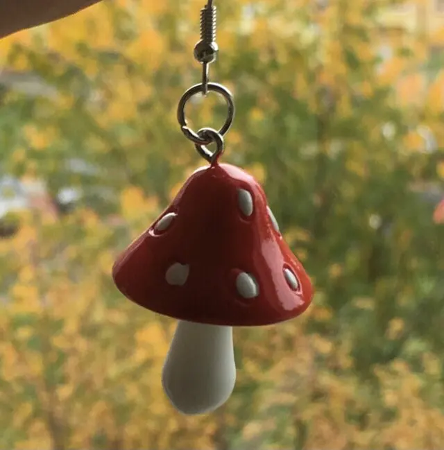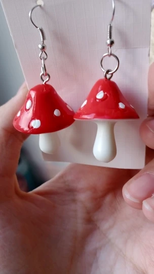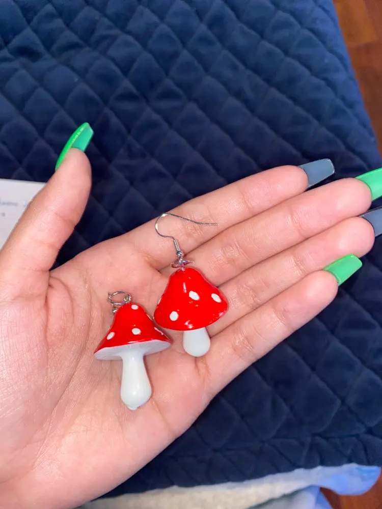 сережки очень красивые не тяжелые точечки немного сдвинуты но это не бросается в глаза все пришло в хорошем состоянии по размеру отлично, единственное это то что когда сережка упала отломалась ножка у грибочка