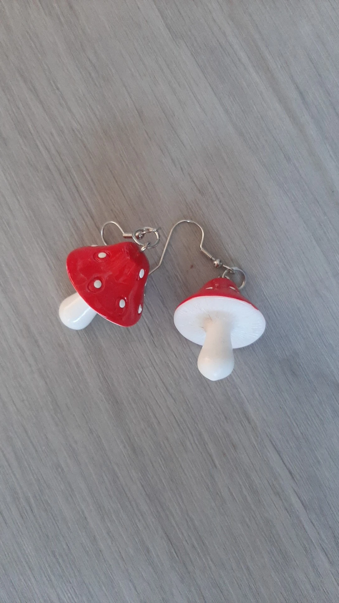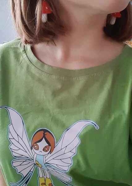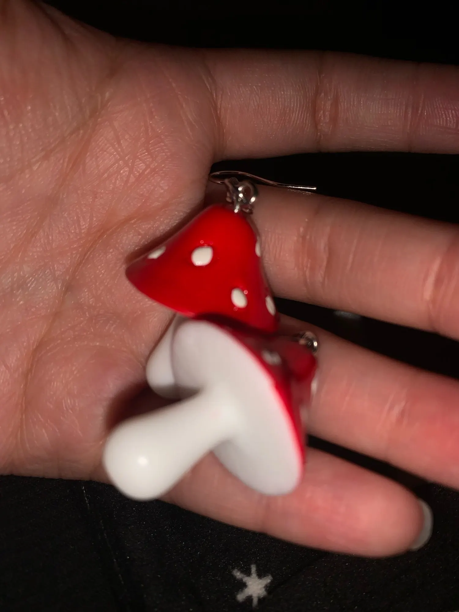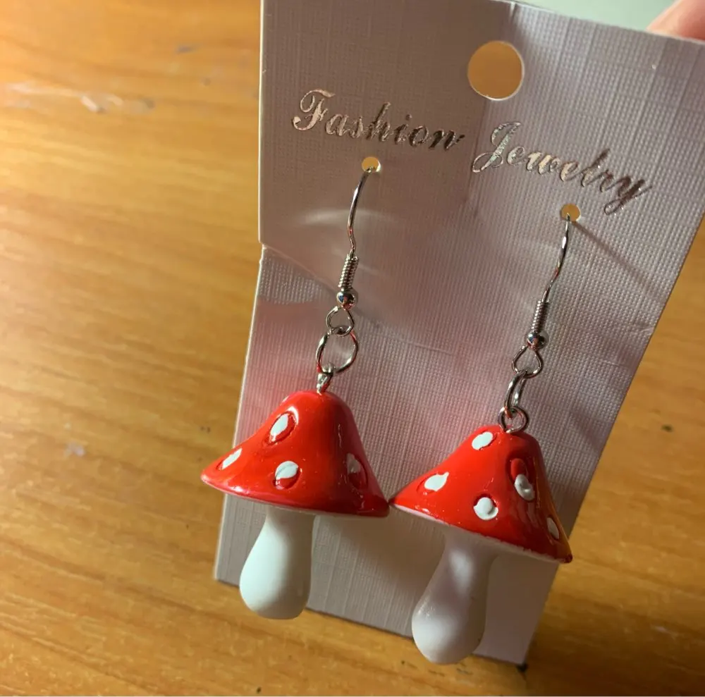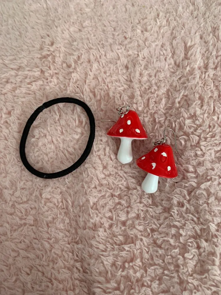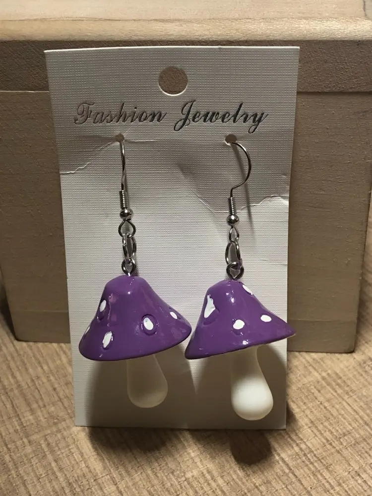 сережки очень красивые не тяжелые точечки немного сдвинуты но это не бросается в глаза все пришло в хорошем состоянии по размеру отлично, единственное это то что когда сережка упала отломалась ножка у грибочка