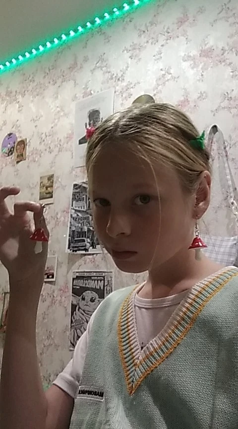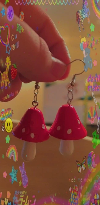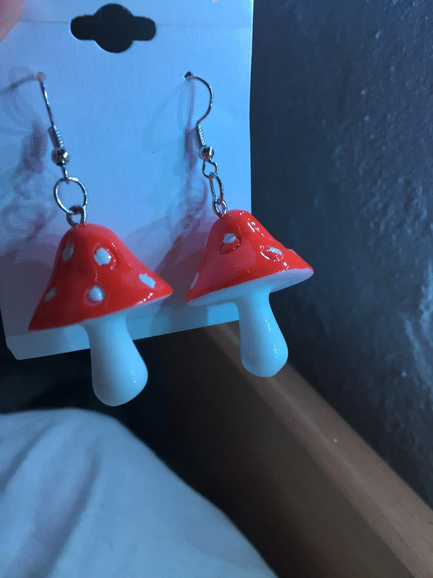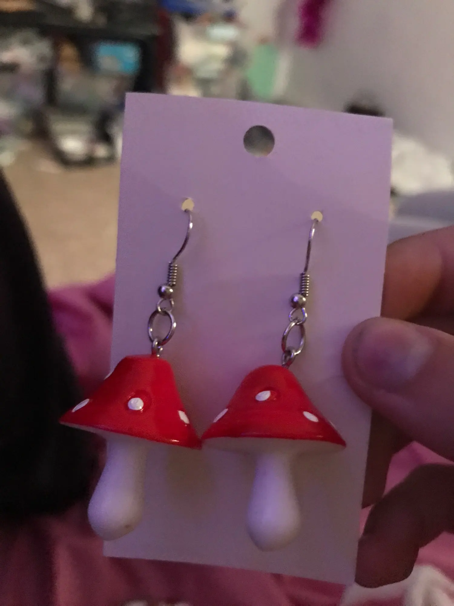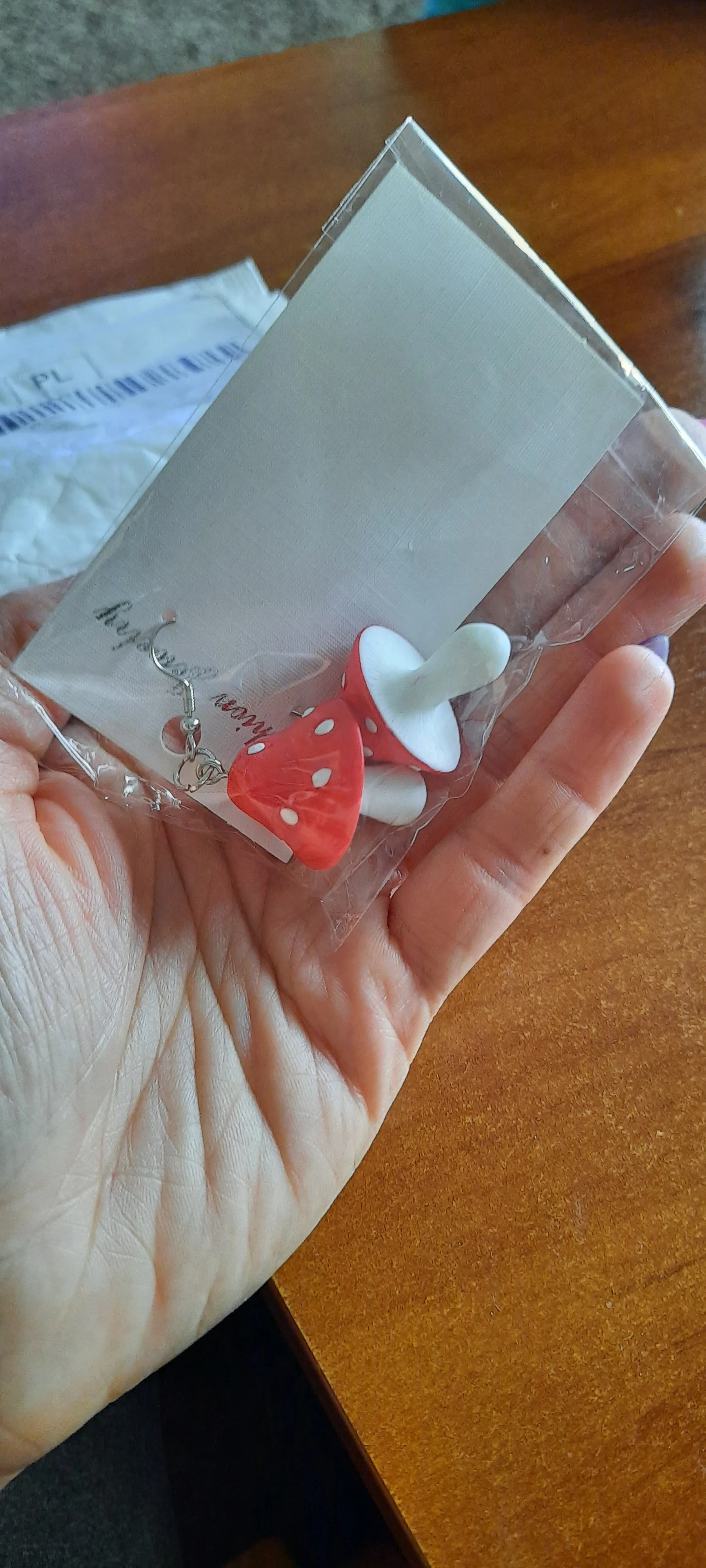 сережки очень красивые не тяжелые точечки немного сдвинуты но это не бросается в глаза все пришло в хорошем состоянии по размеру отлично, единственное это то что когда сережка упала отломалась ножка у грибочка