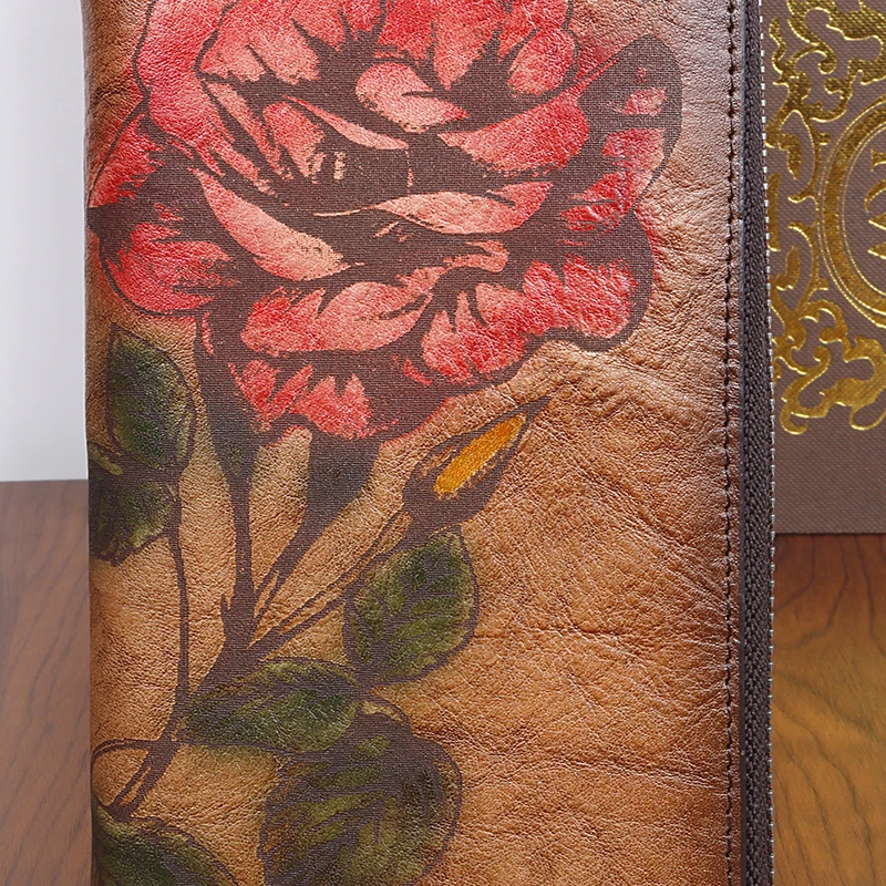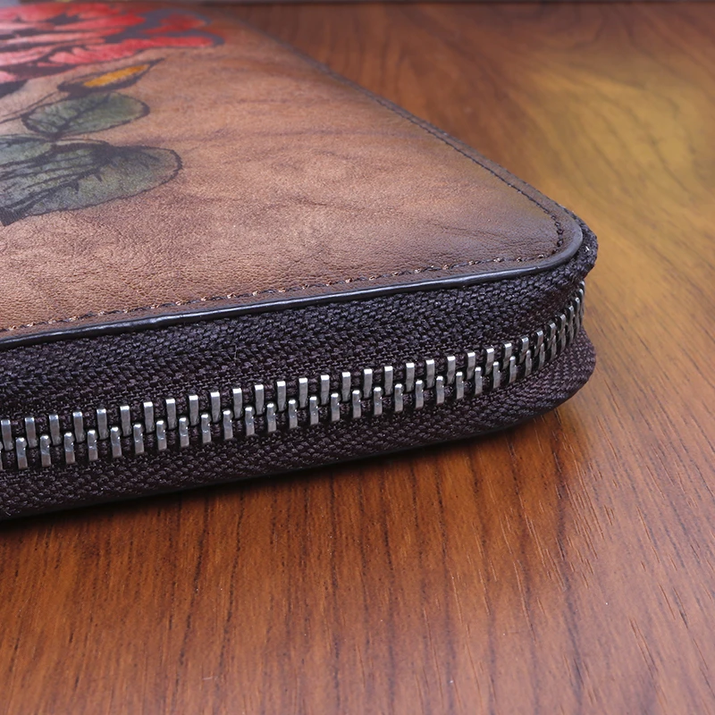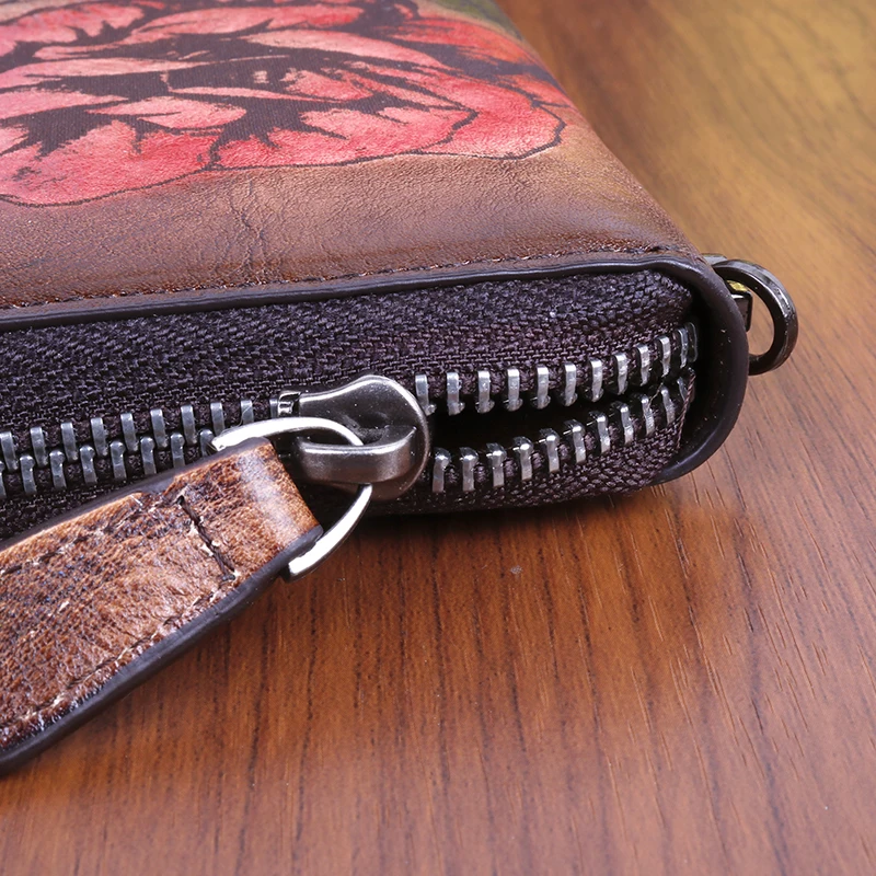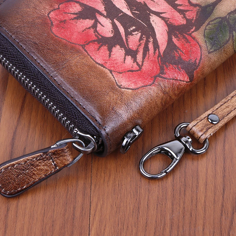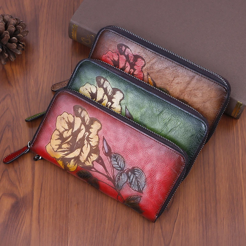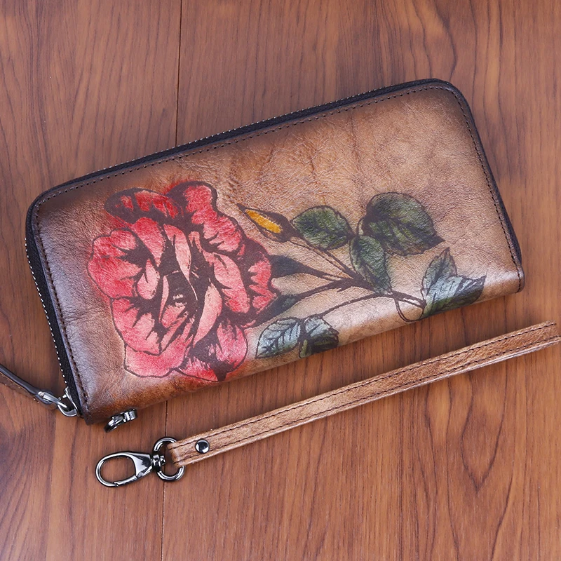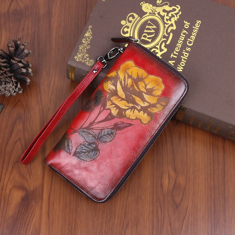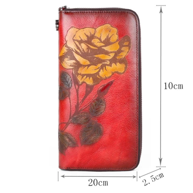 Кошелек женский из натуральной кожи, удобный клатч с тиснением, длинный Дамский бумажник из воловьей кожи в стиле ретро с зажимом для карт и розами, наручный клатч
