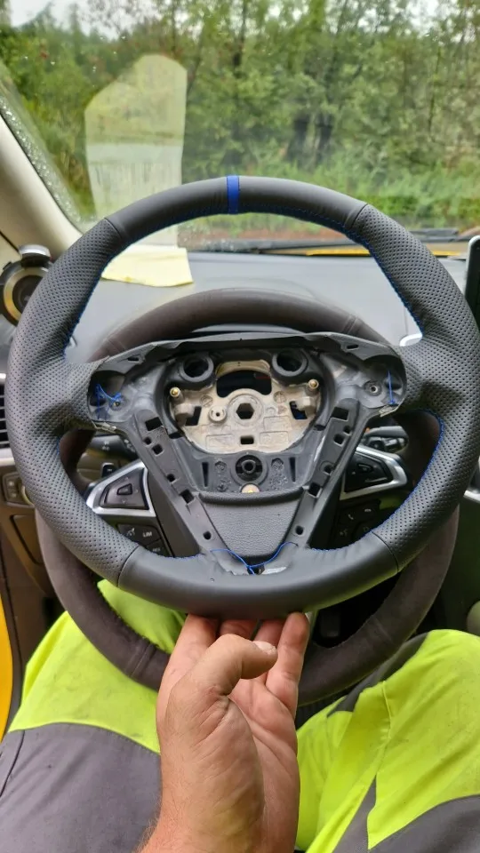 Сшитый вручную черный чехол рулевого колеса автомобиля из искусстве...