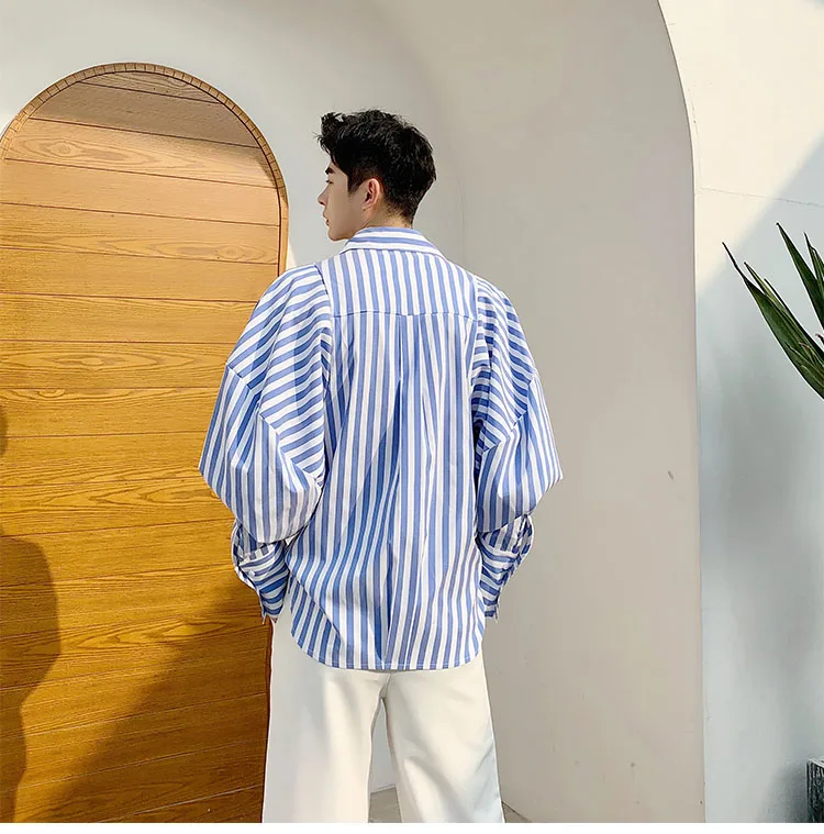 Men Retro Fashion Puff Sleeve Casual Stripe Shirt Male Streetwear Vintage Punk Gothic Loose Dress Shirts Stage Clothing