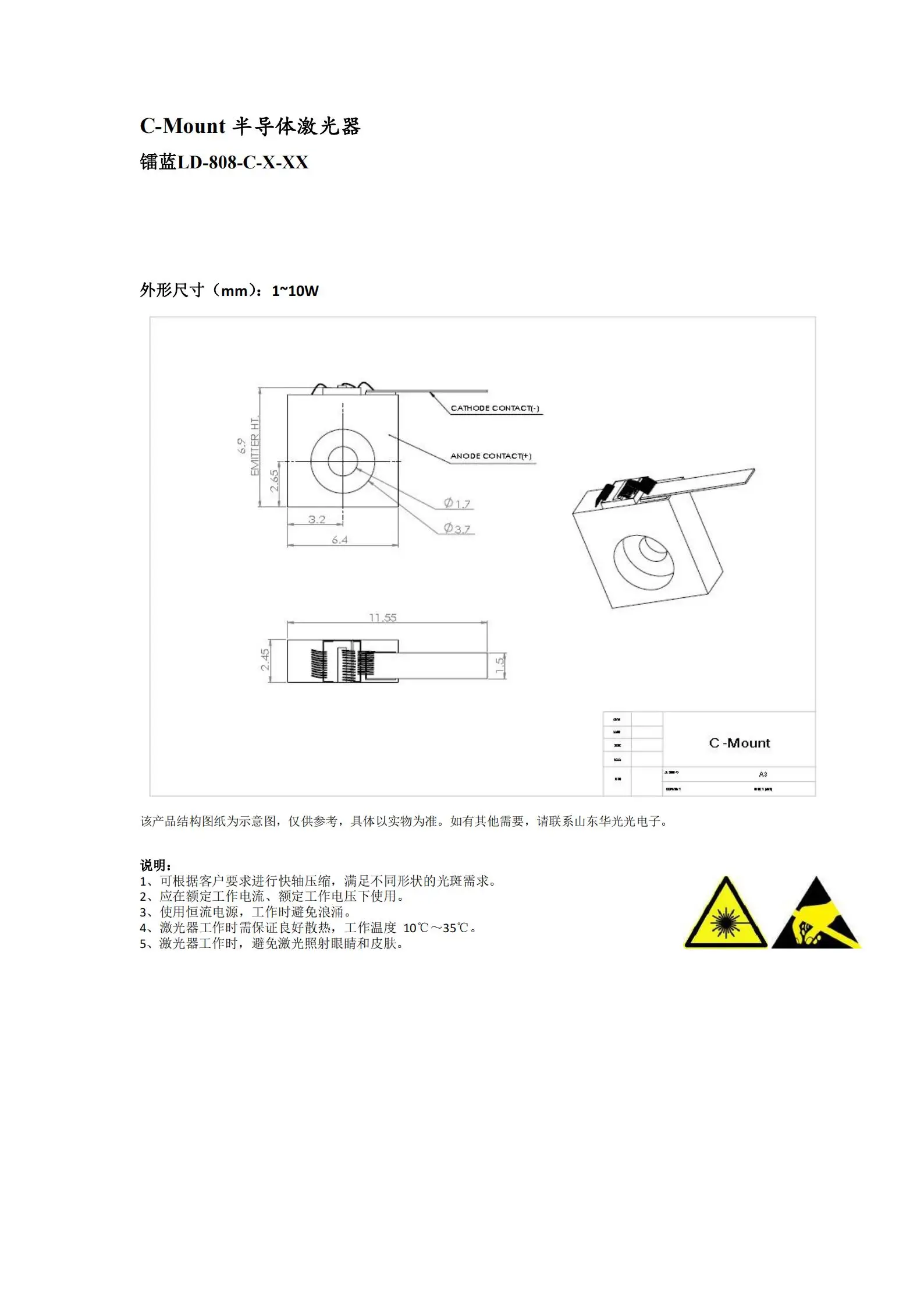 C-mount посылка высокого Мощность 0,5 W, 1 Вт светодиодные лампы, 2 Вт, 3 Вт, 5 Вт, 808nm инфракрасный лазерный с факЭтот лазерный диод является промышленным электронным компонентом и используется как промышленный завет, лаборатория, сделай сам.Пожалуйста, держите объектив чистым, чтобы сделать лазерный луч чистым и ярким. Перед использованием некоторых видов лазерных работ, пожалуйста, сначала прочитайте техническую информацию и Защитите глаза перед лазерным излучением. Убедитесь, что оператор имеет опыт в оптике DIY или тесте.СпецификацияМодель 808D-cmountВыход Мощность 0,5 Вт-5 ВтДлина волны 805нм +-3 НмРабочая температура 10 ~ 40 центи-градусовПосылка 1 X C-mount 808nm диод с fac