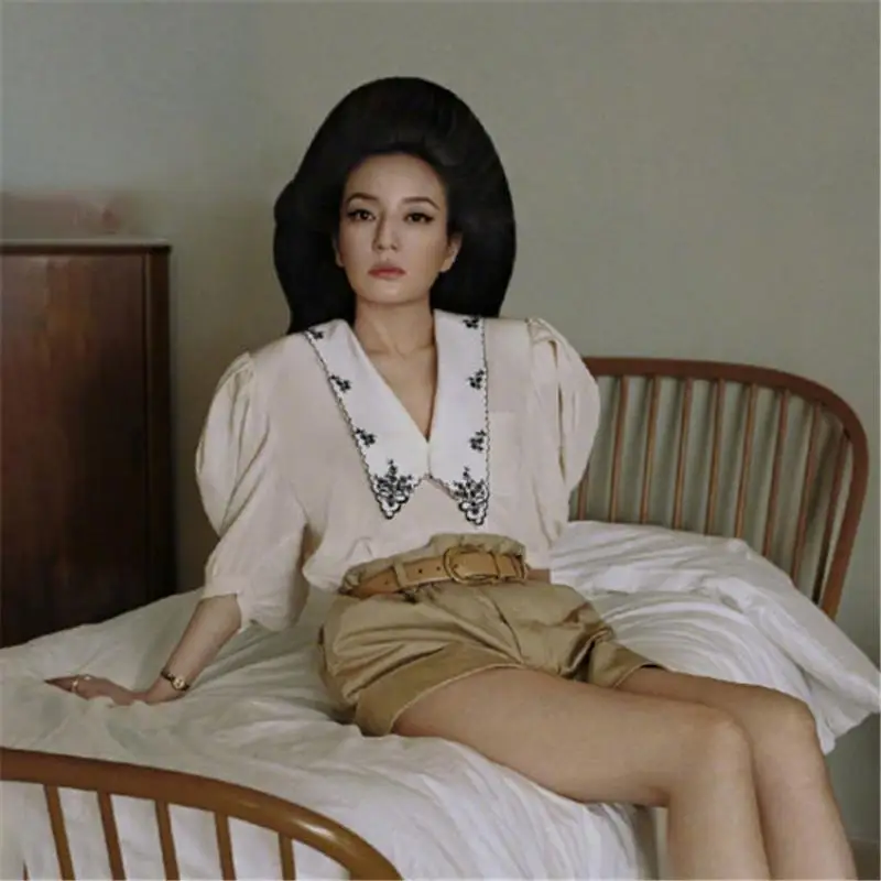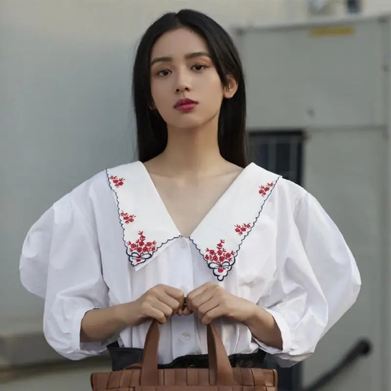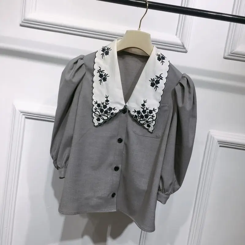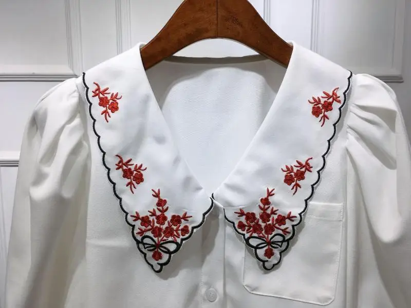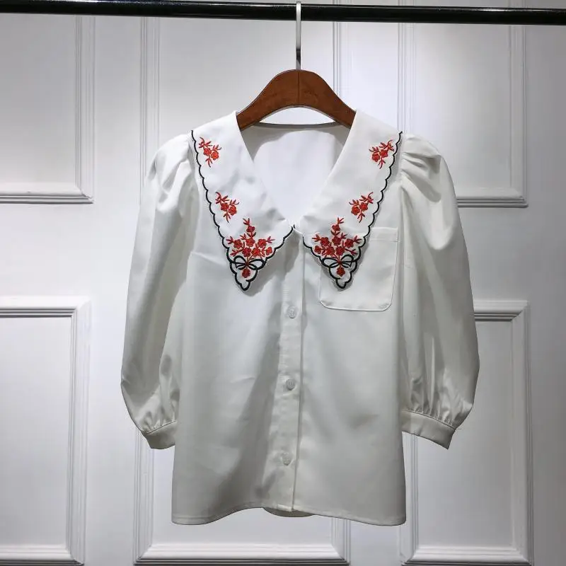 Подиумная рубашка с цветочной вышивкой, отложным воротником и коротким рукавом, свободная рубашка в французском ретро-стиле, брендовый дизайнерский Топ, Новинка лета 2020