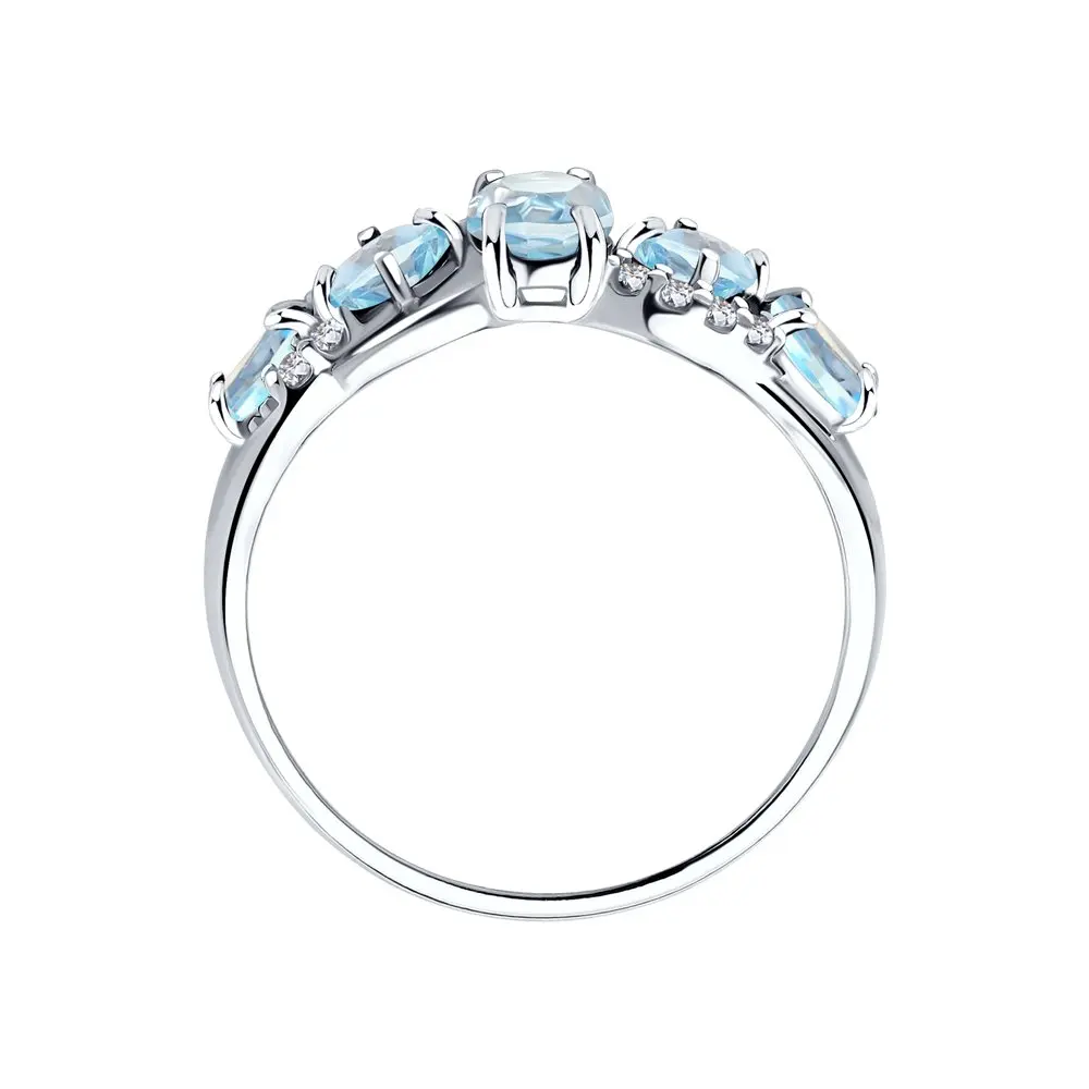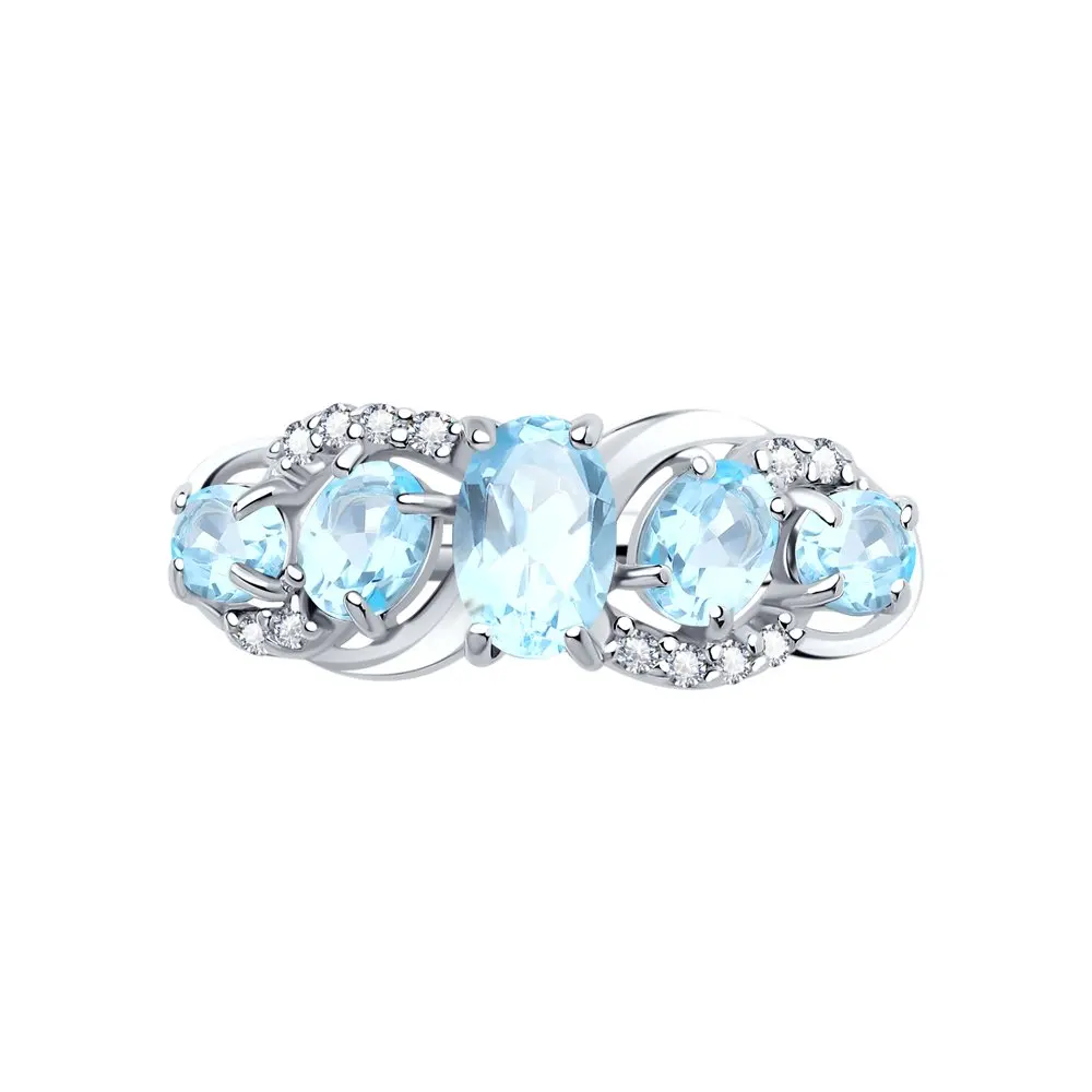 Кольцо SOKOLOV из серебра с топазами и фианитамиЧистота и прозрачность весеннего неба, свежесть морского бриза – кольцо из серебра с топазами и фианитами способно вызвать самые красочные ассоциации. Светлый оттенок металла выгодно подчёркивает нежно-голубой цвет топазов. Вставки фианитов органично включены в дизайн и добавляют украшению мерцающие блики. Купить кольцо с натуральными камнями по очень приятной цене можно во флагманских магазинах SOKOLOV.
