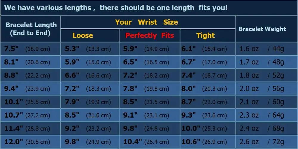 Как выбрать правильный размер?1:Измерьте размер запястья.(Пожалуйста, посмотрите на последнюю картинку, которая показывает, как измерить ваше запястье)2:Пожалуйста, посмотрите на таблицу размеров ниже и убедитесь, что ваш размер близок к"Идеально подходит" размер запястья, тогда вы будете знать, какая длина браслета подходит для вас(Если вам нравится браслет более свободный, пожалуйста, убедитесь, что размер запястья близок к размеру свободного кроя)