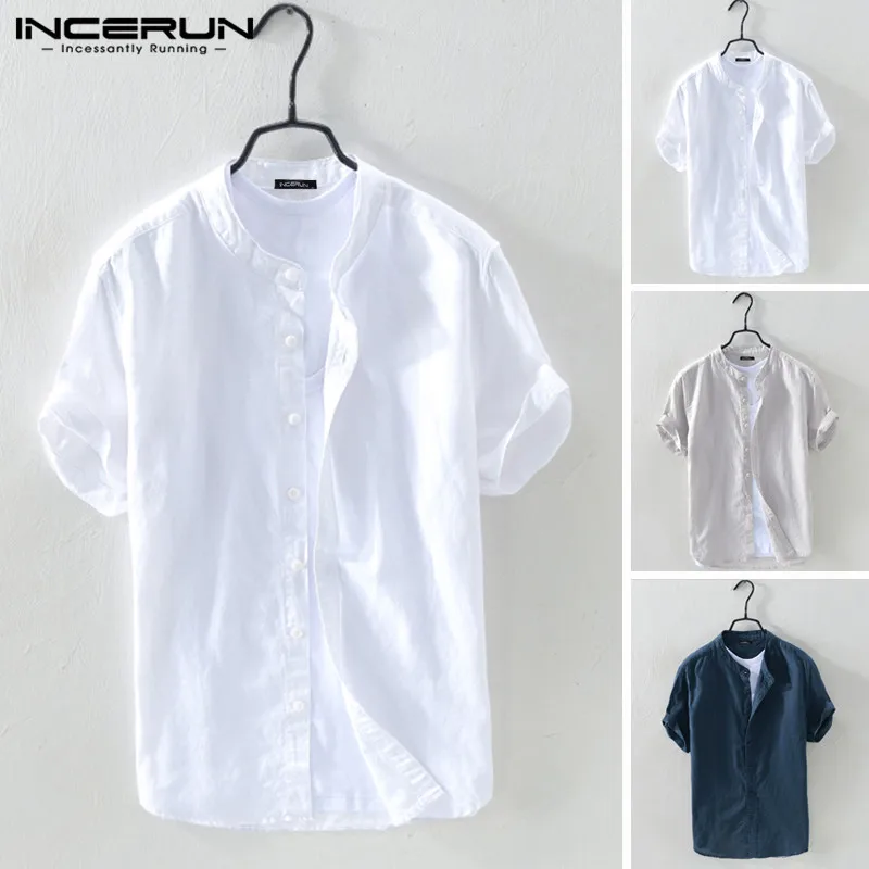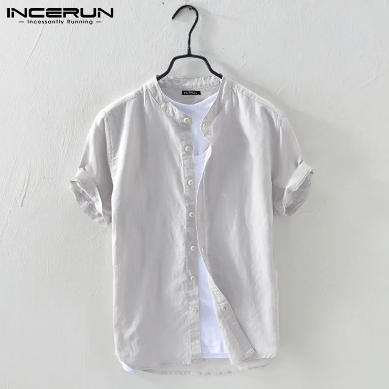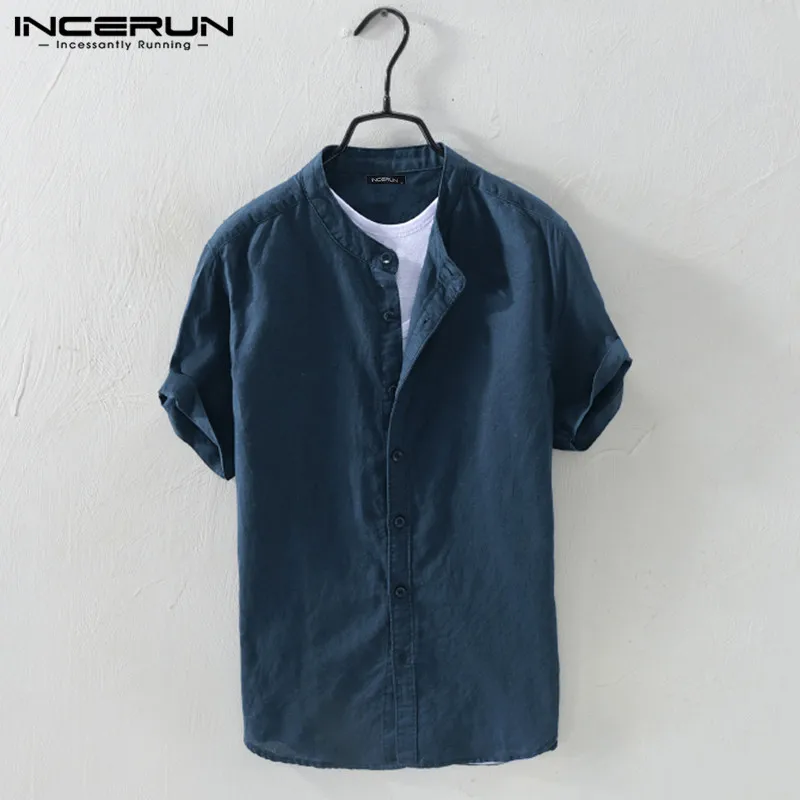 Рубашка мужская хлопковая однотонная, с воротником-стойкой и коротким рукавом
