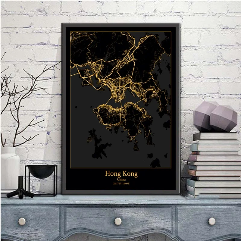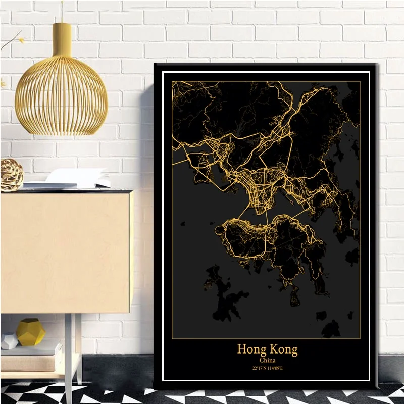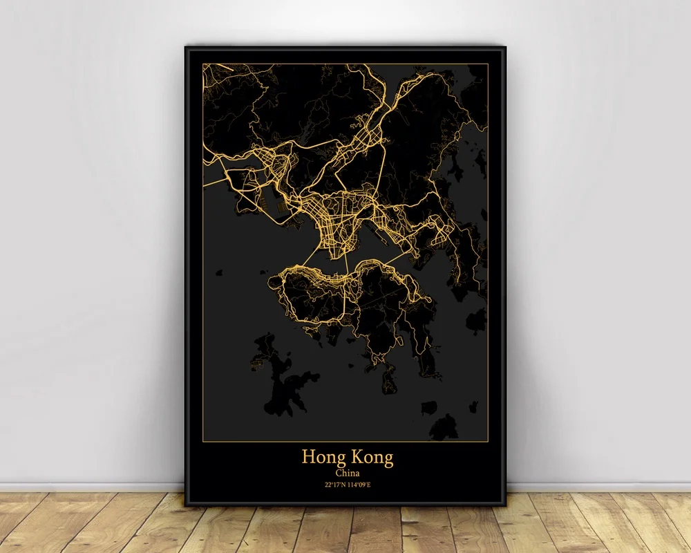 Hong Kong Китай черный и золотой город светильник Карты изготовленный на заказ карта городов мира Плакаты Печать на холсте Nordic Стиль Wall Art домашний декор