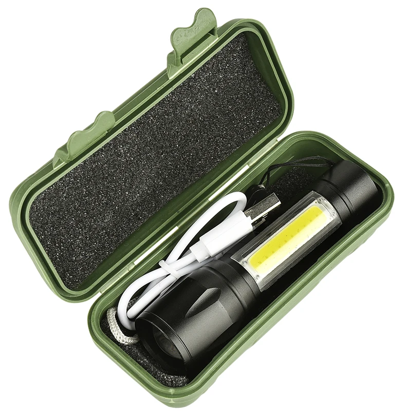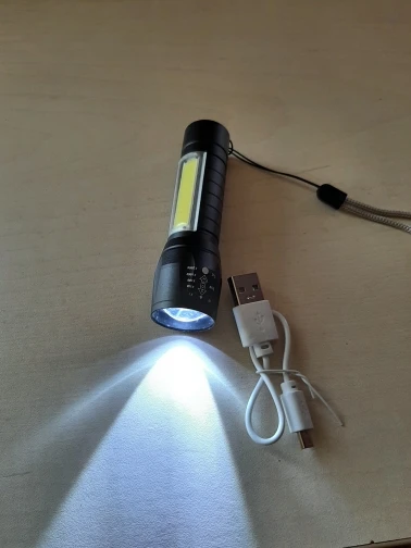 Быстрая доставка. С первого взгляда фонарик в порядке по цене. Он имеет 3 режима: Обычный зум-фонарик, стробоскоп и боковой свет. Аккумуляторная батарея входит в комплект, но она недоступна. Зарядка осуществляется с помощью обычного кабеля micro USB и зарядного устройства для телефона. Конечно, интенсивность не рекламируется. Основываясь на сравнении с известными брендами фонарей, я бы сказал, что реальная интенсивность света составляет около 100-150 люмен. Для меня этого достаточно, но имейте в виду, что при заказе вы не получите небольшой фонарик, способный выпустить безумный свет.