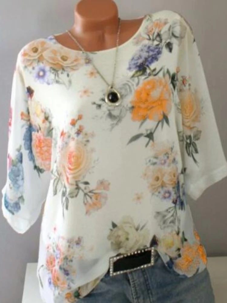 Блузка женская шифоновая с коротким рукавом и цветочным принтом, в стиле оверсайз