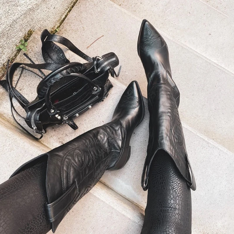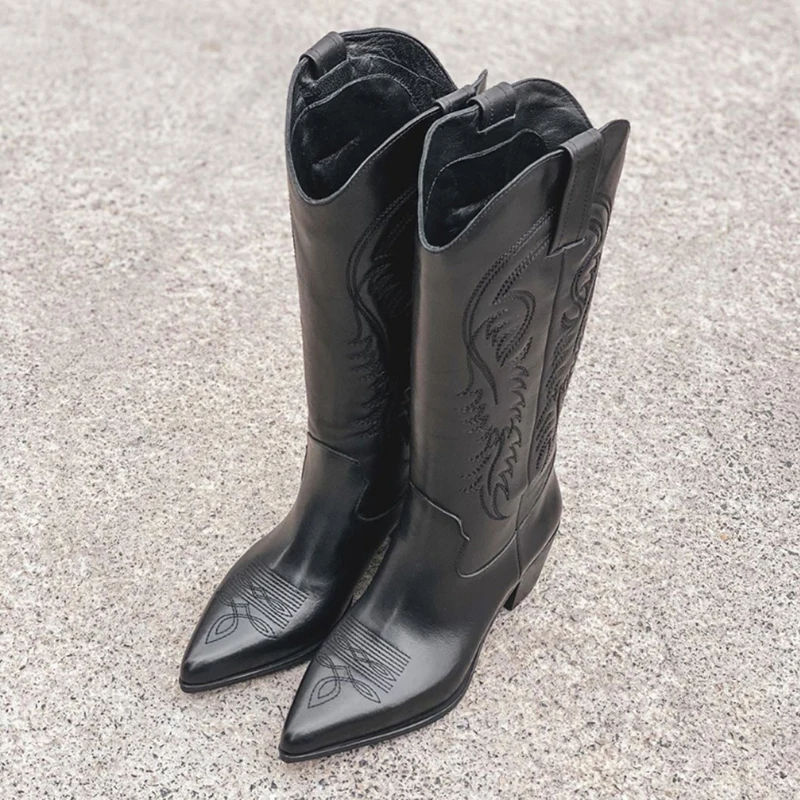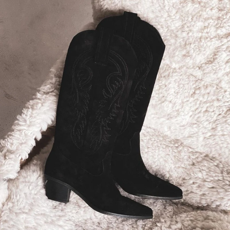 Сапоги женские зимние, черные, замшевые, с вышивкой, на каблуке-рюмочке