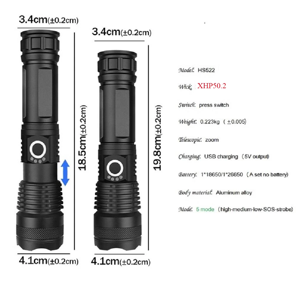 1. Бренд: PAWEINUO2. Модель светодиодных бусин: XLamp XHP50.23. Светодиодная лампа/срок службы: 100 000 часов4. Диапазон: 300-600 метров5. Размер: 16,6 см * 4 см * 3,3 см6. Режим масштабирования: телескопический зум7. 5 режимов: высокий/средний/низкий/Стробоскоп/SOS8. Тип батареи: 1x18650 или 1x26650 аккумулятор9. Уровень водонепроницаемости: IPX-610. Цвет корпуса: черный12. Материал: T6063-T6 авиационный алюминий.13. Вес нетто факела: 0,192 кг14. Перезаряжаемый: micro usb для компьютера USB, Автомобильный USB, USB разъем для зарядки15. Время освещения: аккумулятор 18650 2-4 часа; аккумулятор 26650: 4-6 часов.16. Тип фонарика: семья, охота, патрулирование, ходьба, техническое обслуживание, работа, поиск и спасение