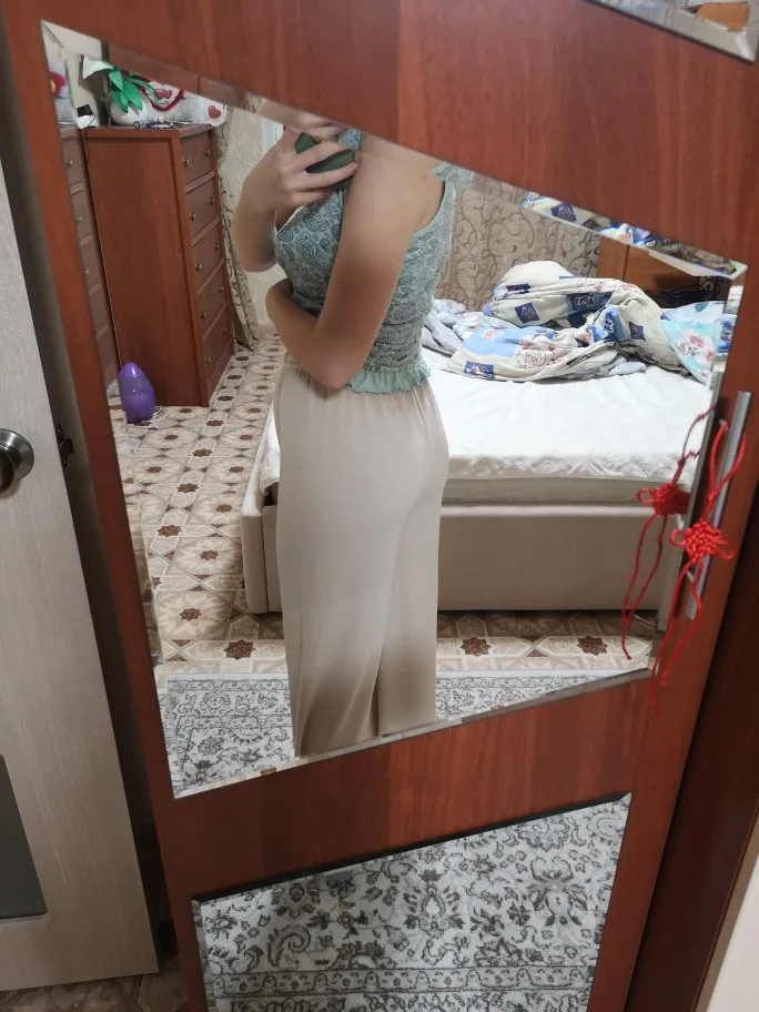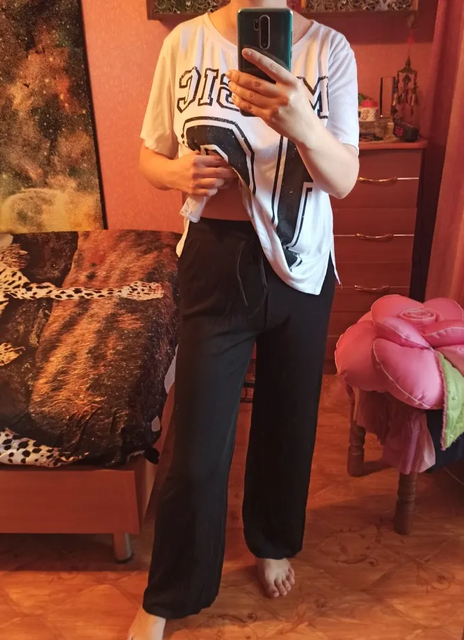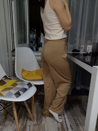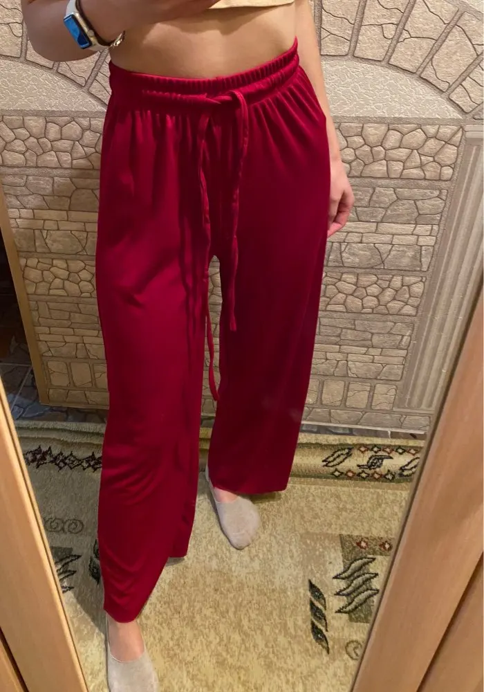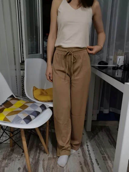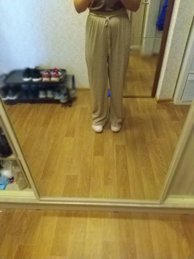 Очень понравились брюки . Почитала отзывы и заказала на размер больше. Мягкая, струящиеся ткань. Из минусов , оказались уж очень короткие , думала по щиколотку будут . Мой рост 158, девочкам повыше ещё короче будет . А ещё , ткань очень тонкая , если есть лишний вес , будут видны все неровности .