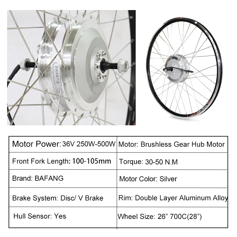 БудущееЛегко конвертировать, сделай сам переднее колесо ebike конверсионный комплект для велосипеда с передним выпадающим размером "100-105 мм". Легко преобразуйте педаль велосипеда в моторизованный велосипед в течение 1 часа.Bafang стабильная приводная система, этот передний приводной двигатель, который совместим с дисковым тормозом и V тормозом, имеет номинальную мощность 250 Вт, 350 Вт 500 Вт, обеспечивает идеальную мощность для транспортных средств. Сильный и эффективный, этот двигатель значительно повышает комфорт при езде и подходит для поездок на велосипедах, пригородных велосипедах и горных велосипедах.Супер экономичный, скорость до 38-40 кмн, 50 нм, эффективность ≥ 80%; Тормозные рычаги отключают источник питания к двигателю безопасно.Полные аксессуары, поставляется со всеми необходимыми аксессуарами. Переднее колесо и двигатель, контроллер, уровень тормоза, дроссельная заслонка большого пальца (опционально), чехол контроллера, ЖК-дисплей, кабель двигателя, PAS, водонепроницаемый основной кабель, светодиодный светильник. zed bike в течение 1 часа.