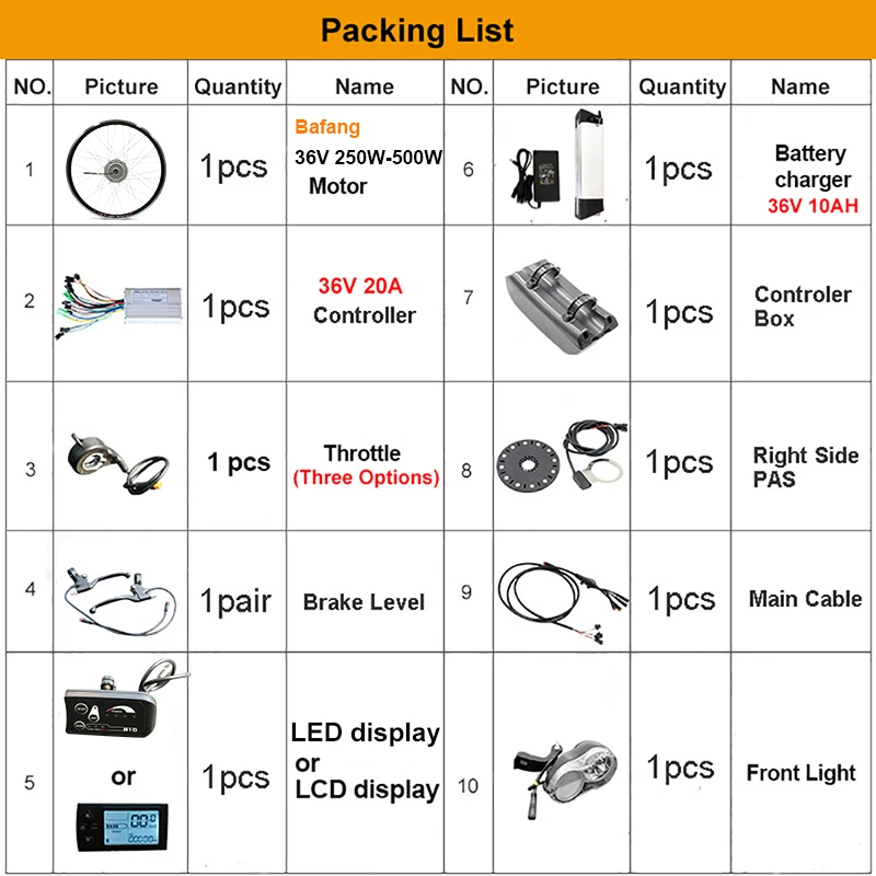 1 шт. * Двигатель Bafang с ободом и спицами1 шт. * контроллер двигателя1 шт. * передний светильник1 шт. * коробка контроллера (бесплатный подарок)1 шт. * дисплей (светодиодный/ЖК-дисплей)1 шт. * Водонепроницаемый основной кабель1 шт. * кабель двигателя1 шт. * дроссельная заслонка/половина закрутки1 шт. * 12 магнит PAS1 шт. * Аккумулятор (36V10AH)1 шт. * зарядное устройство (европейский стандарт, если вы не из Европы, мы добавим конверсионную вилку)1 пара * тормозной рычаг (может быть изменен на Гидравлический тормозной датчик свободно, пожалуйста, оставьте нам сообщение, если вам нужно)