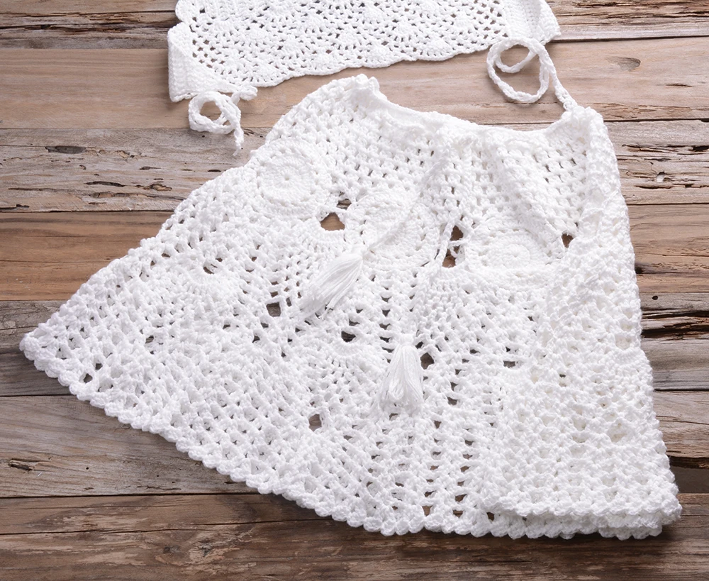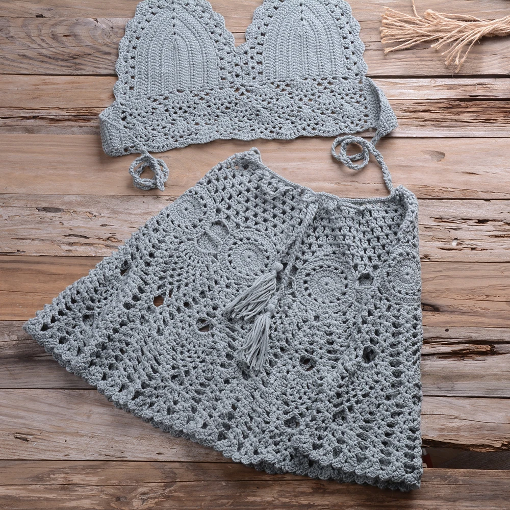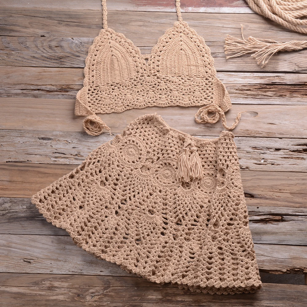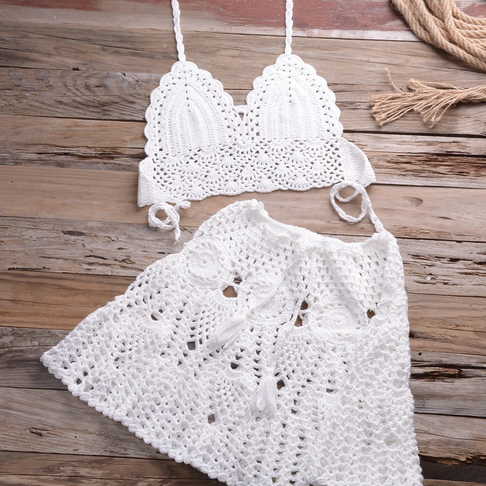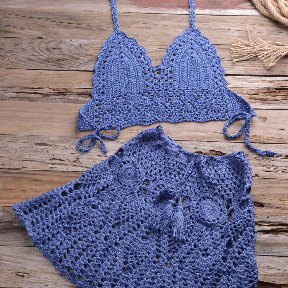 Женский вязаный комплект бикини, из двух частей, накидка, юбка для плавания, пляжная одежда для купания