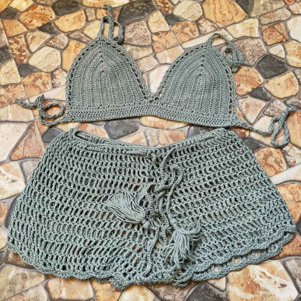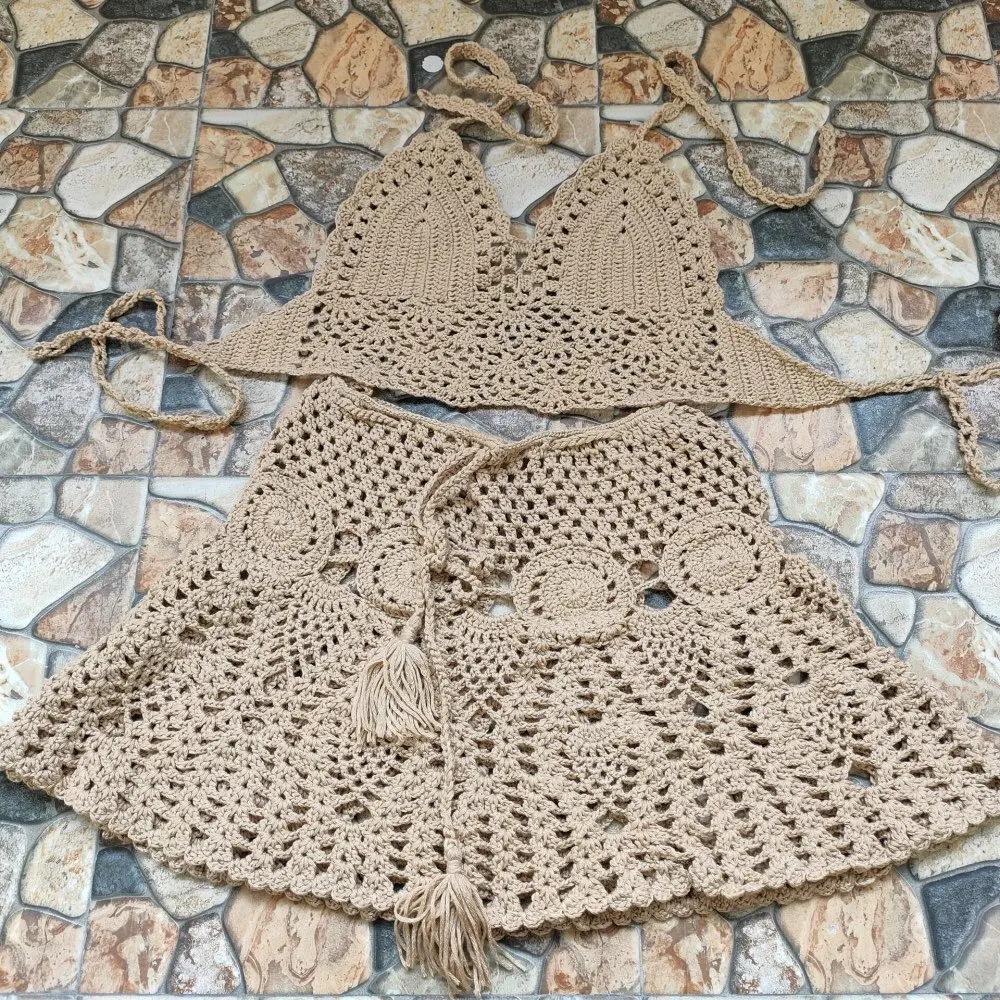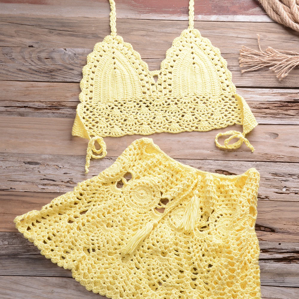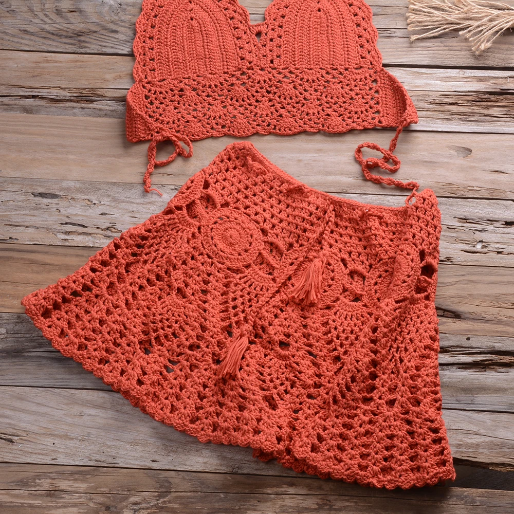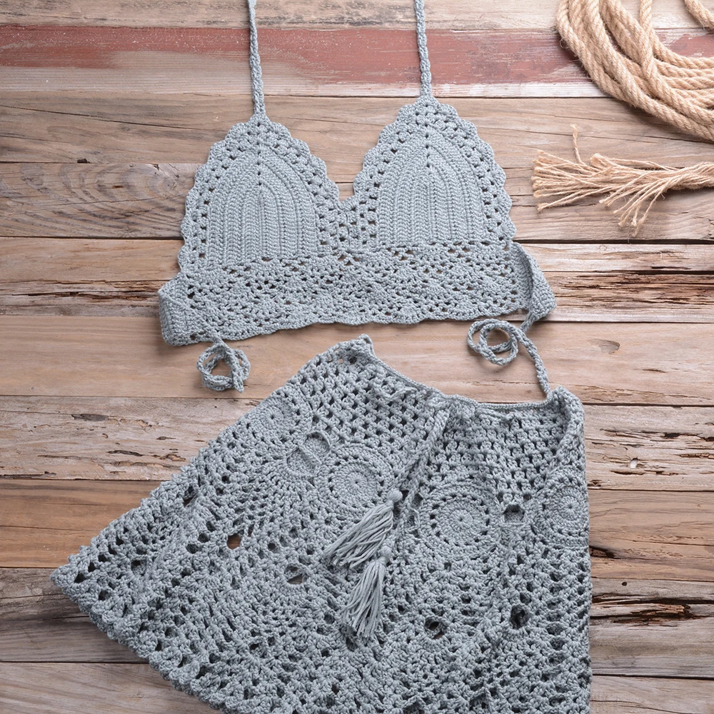 Женский вязаный комплект бикини, из двух частей, накидка, юбка для плавания, пляжная одежда для купания