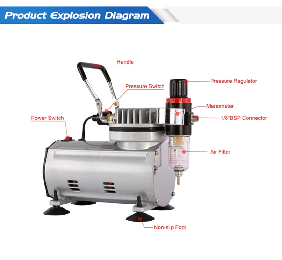 Мощный компрессор аэрографа 1/6 л.с. портативный, компактный и высокоэффективный.
