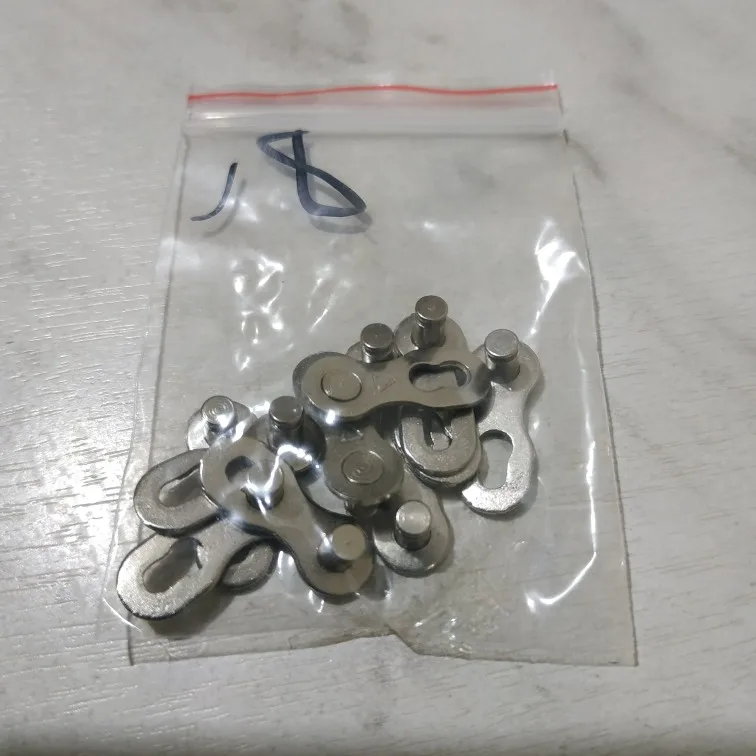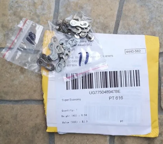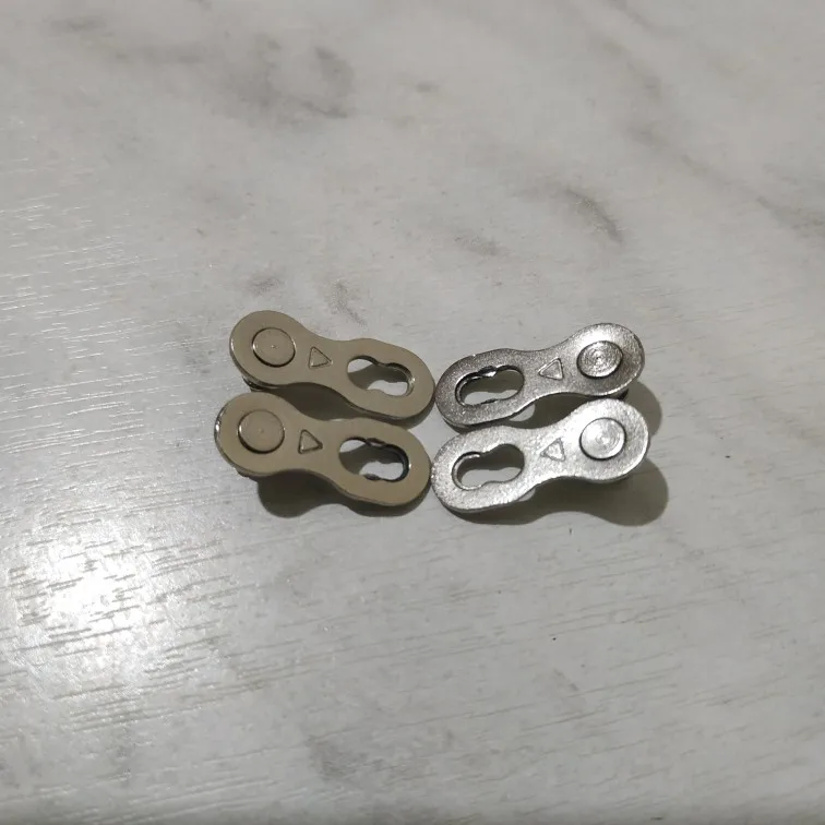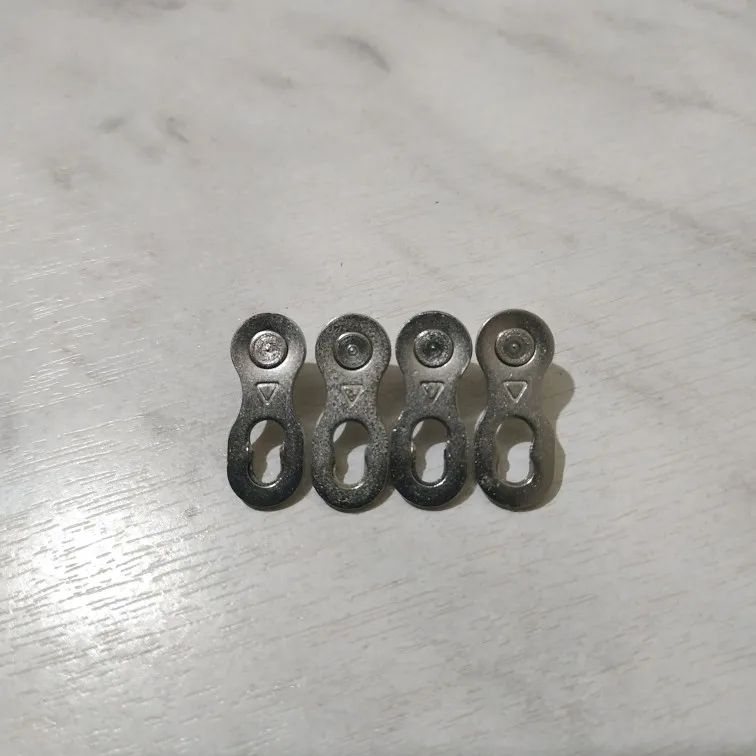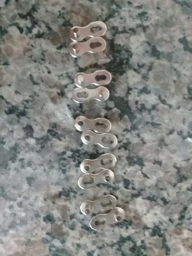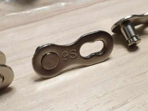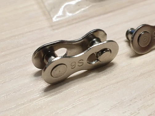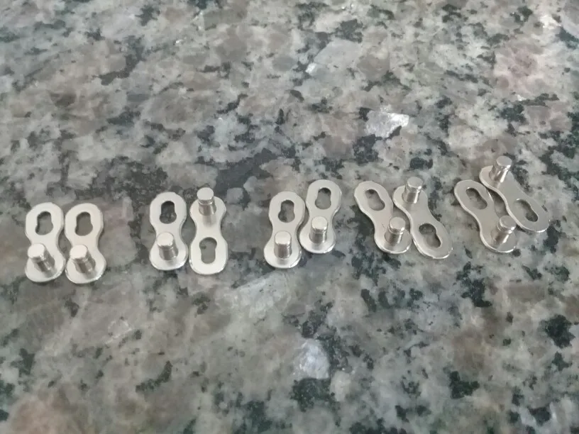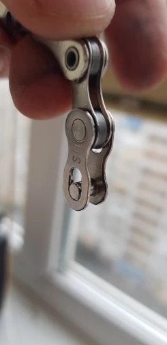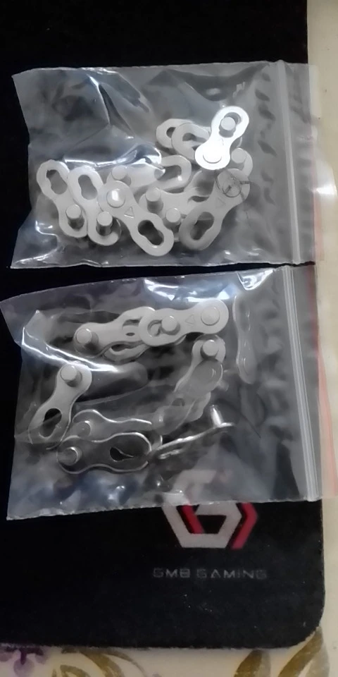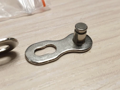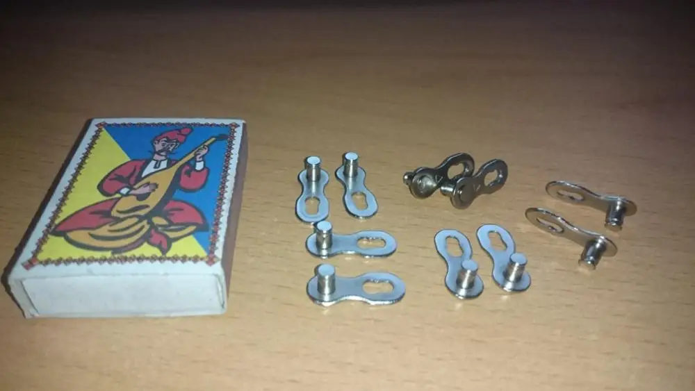 Посылка шла почти два месяца. Замок 8 ск с первого раза не защёлкнулся, как бы сильно не тянуть цепь. После долгих манипуляций и тренировок на сильно изношенной цепи с удалёнными роликами на крайних звеньях, удалось защёлкнуть замок сначала на одной половинке замка, потом на другой. Затем после ещё нескольких защёлкиваниях-снятиях на новой цепи замок стал работать как надо. На фото хорошо видно, чем именно отличаются новые замки от разработанных. Металл достаточно прочный, не пластилиновый, посмотрим, как будет себя вести в реальных условиях.