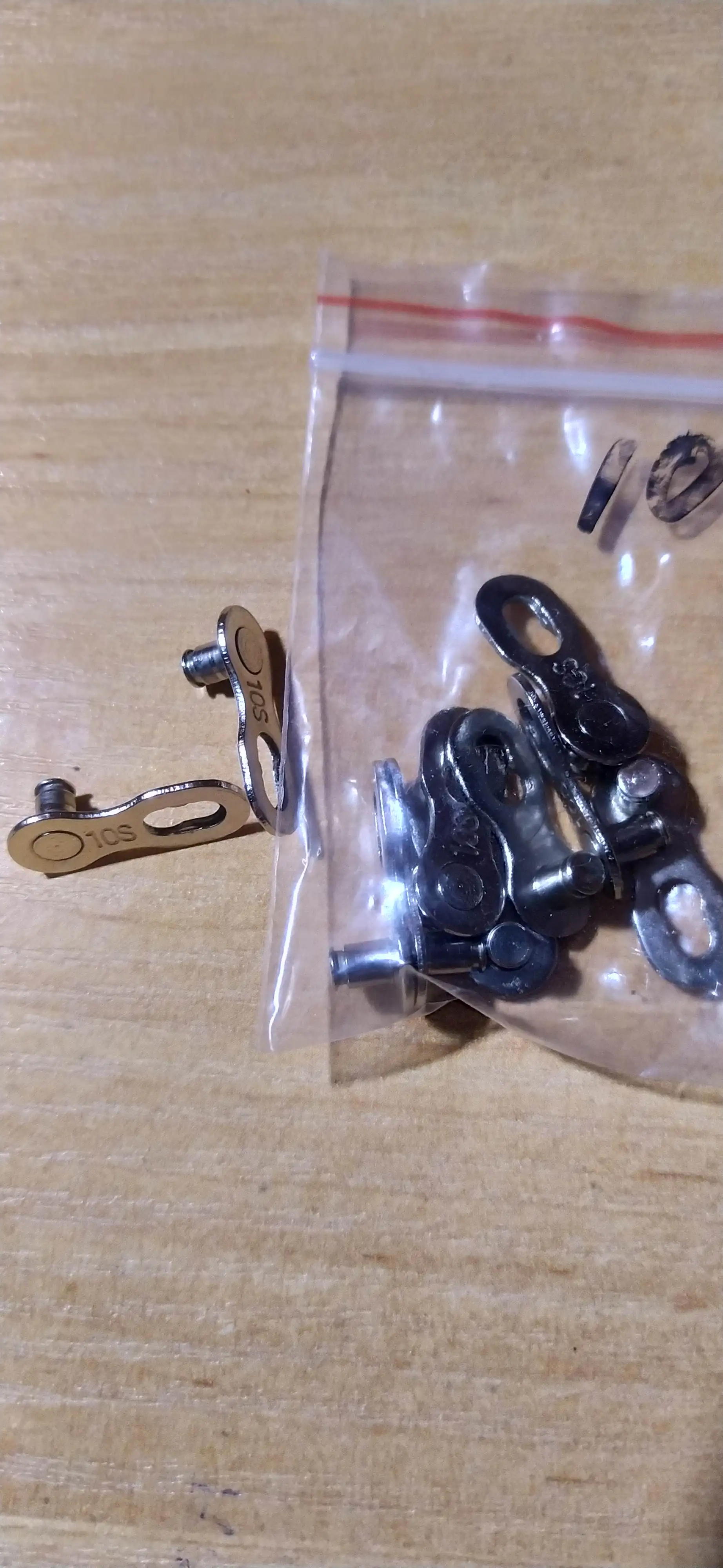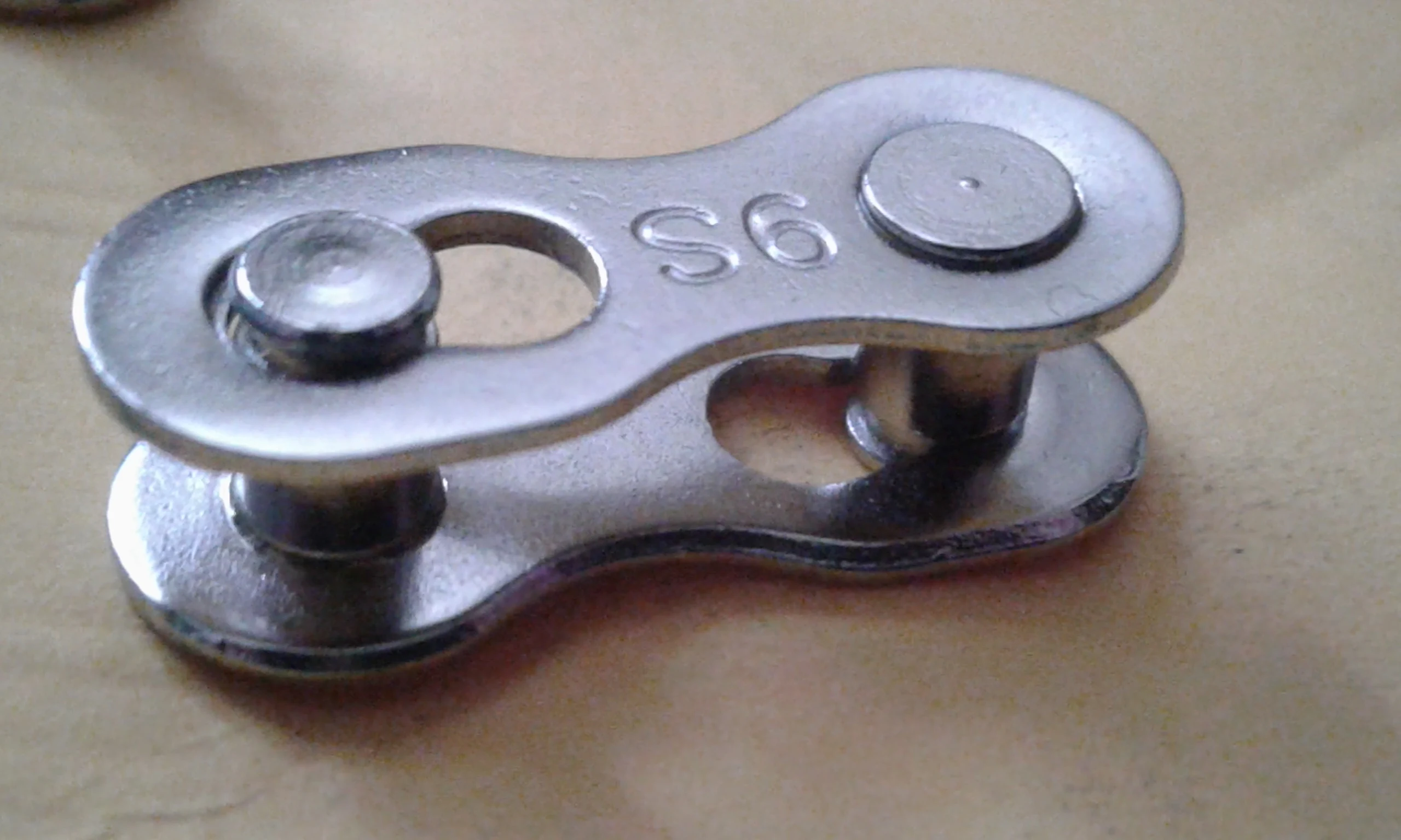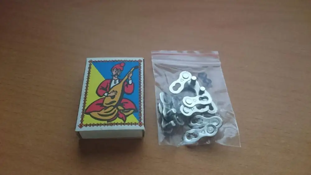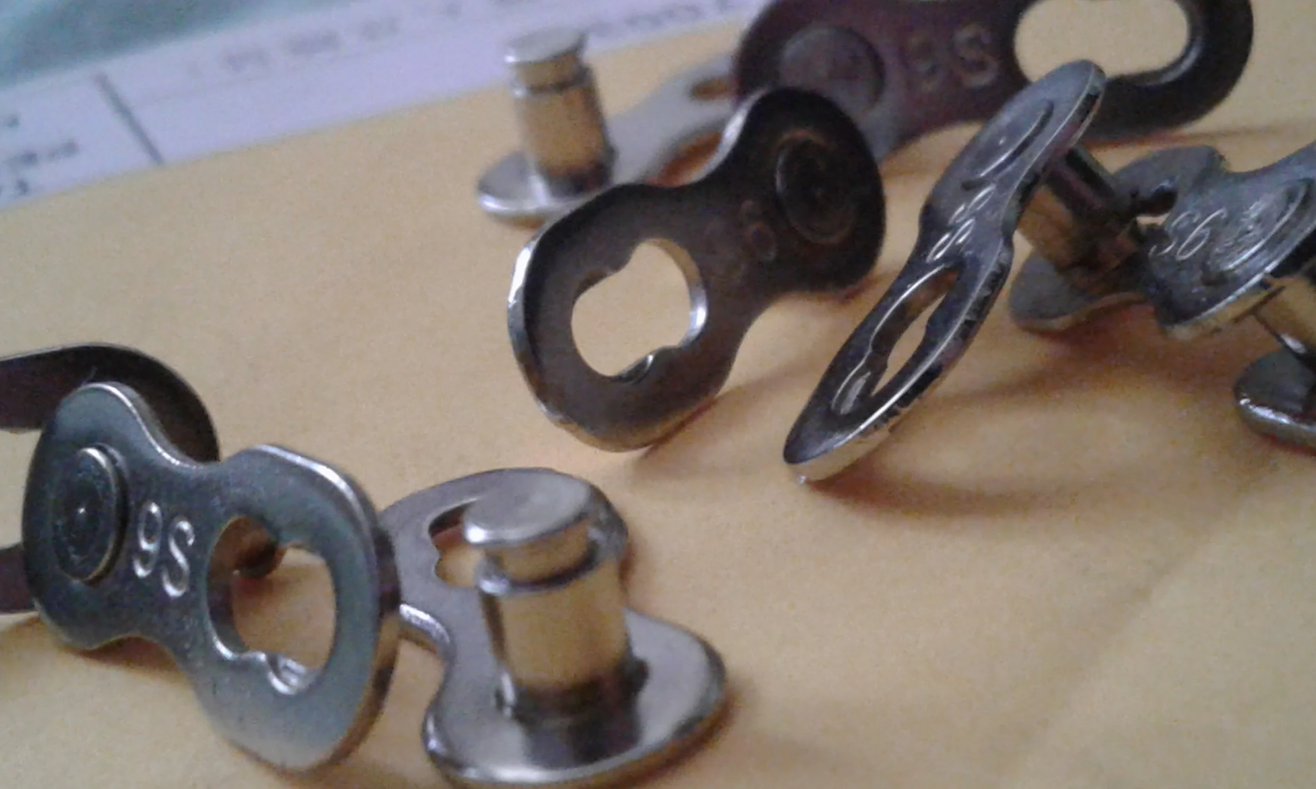 Посылка шла почти два месяца. Замок 8 ск с первого раза не защёлкнулся, как бы сильно не тянуть цепь. После долгих манипуляций и тренировок на сильно изношенной цепи с удалёнными роликами на крайних звеньях, удалось защёлкнуть замок сначала на одной половинке замка, потом на другой. Затем после ещё нескольких защёлкиваниях-снятиях на новой цепи замок стал работать как надо. На фото хорошо видно, чем именно отличаются новые замки от разработанных. Металл достаточно прочный, не пластилиновый, посмотрим, как будет себя вести в реальных условиях.