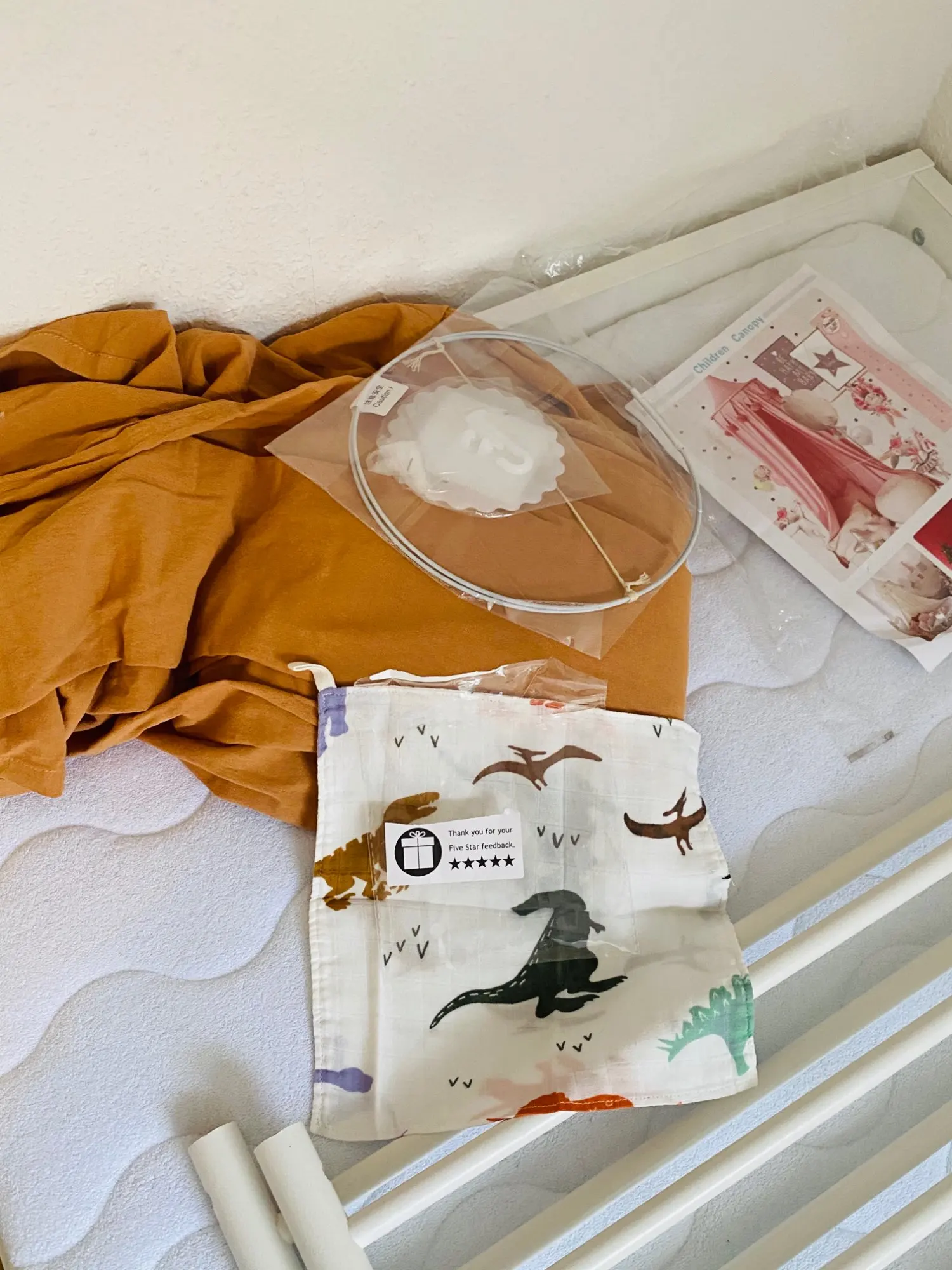 Балдахин приехал очень быстро, заказала 29.11 7.12 уже был на почте в моем городе. Пока ещё не повесили, даже не разворачивала. Ткань- муслин. Позже дополню отзыв фото как выглядит в деле.В подарок положили муслиновый платочек. Спасибо.