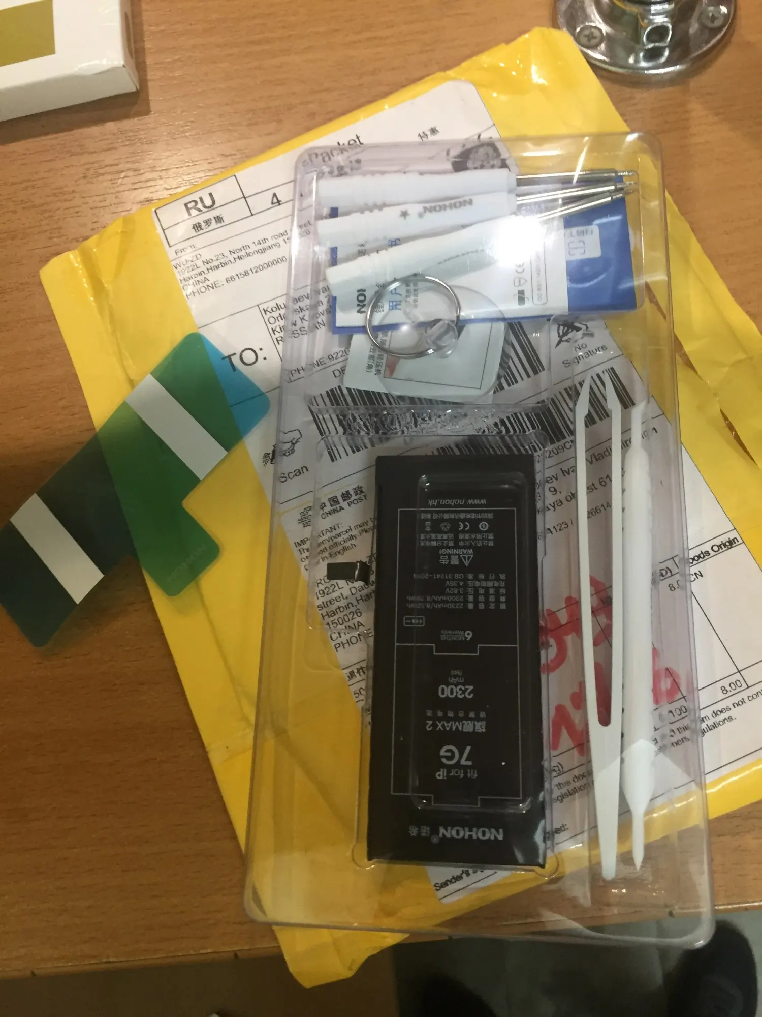 Заказ пришёл за 10 дней, при указанных 7 днях доставки. В комплекте есть все необходимое, даже пылевлагозащита и инструкция по замене батареи. После установки новой батареи, её заряд был на 48%. Трудно было отделить железо от экрана из-за того, что не мог попасть медиатором в нужное место, фен не использовал вообще. Теперь нужно потестить и посмотреть как будет держать заряд.