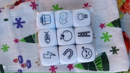 Кости пластиковые, а рисунки очень красивые. Тем не менее, сумка по рождественским причинам. На этот раз это нормально, но в остальном год они должны иметь другой вариант