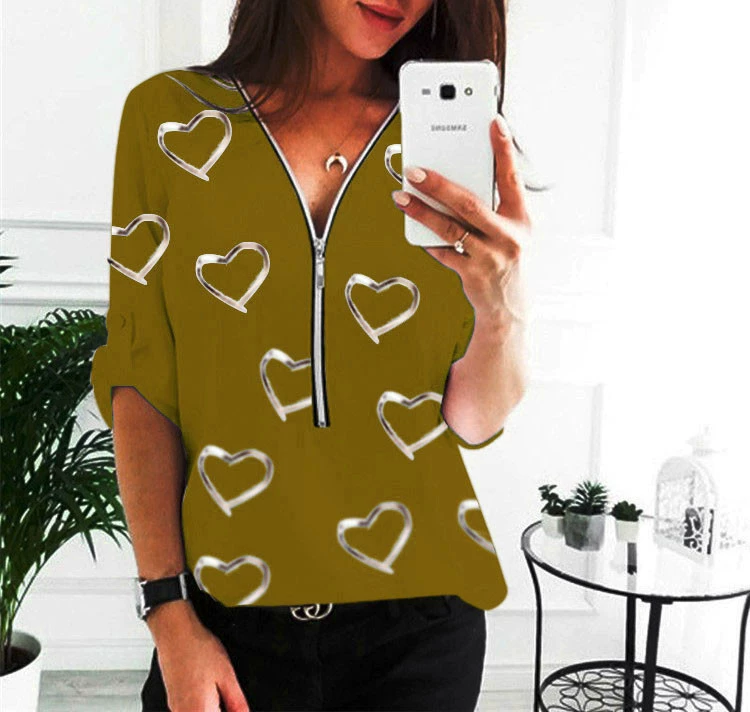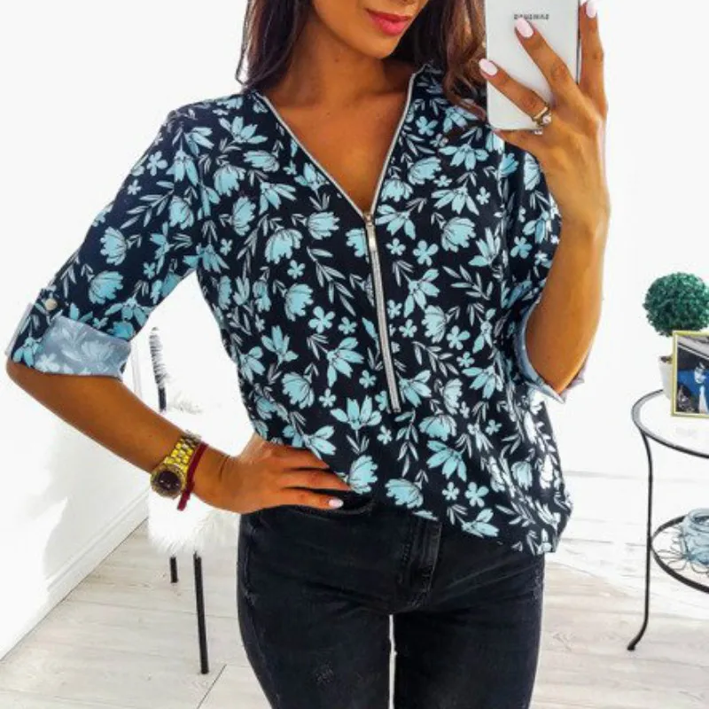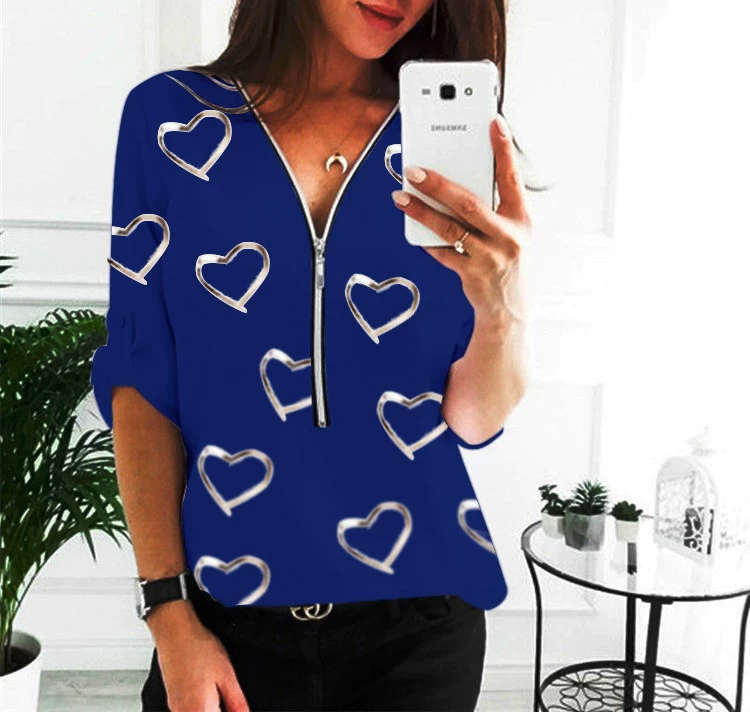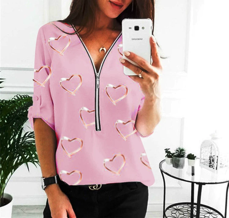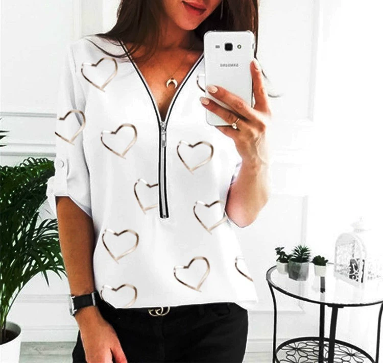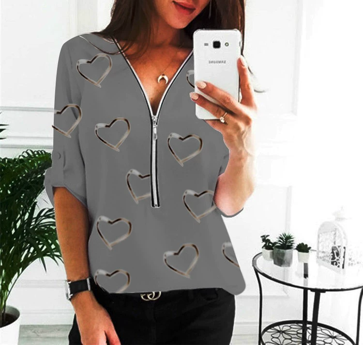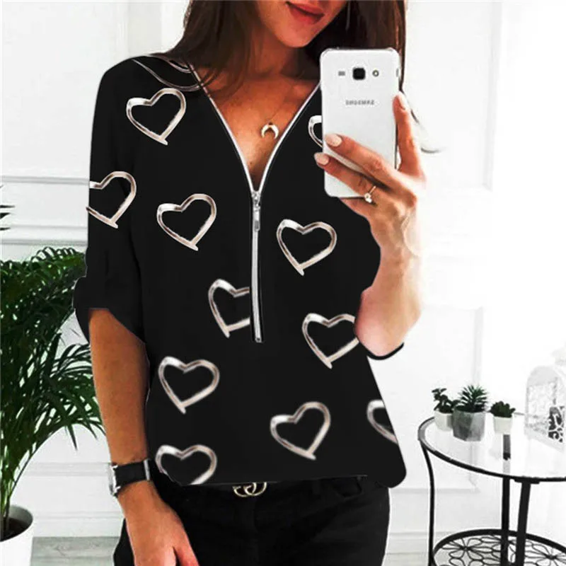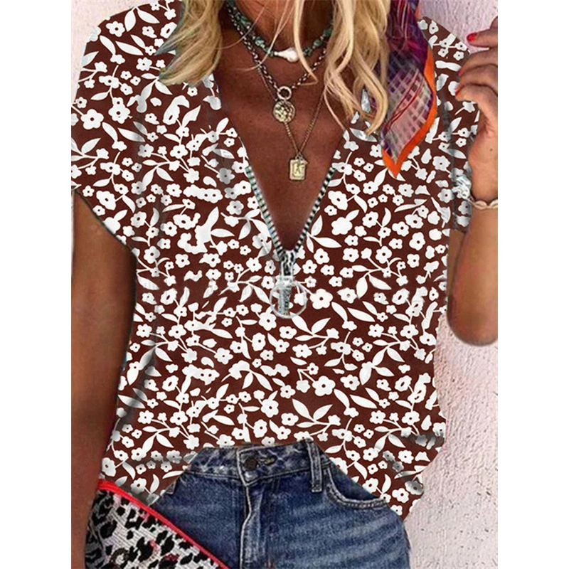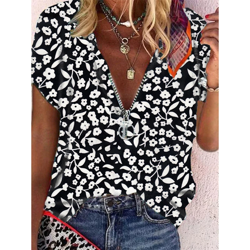 Блузка женская шифоновая на молнии спереди, пикантная рубашка с V-образным вырезом, свободная туника с цветочным принтом, офисный топ с коротким рукавом, на лето