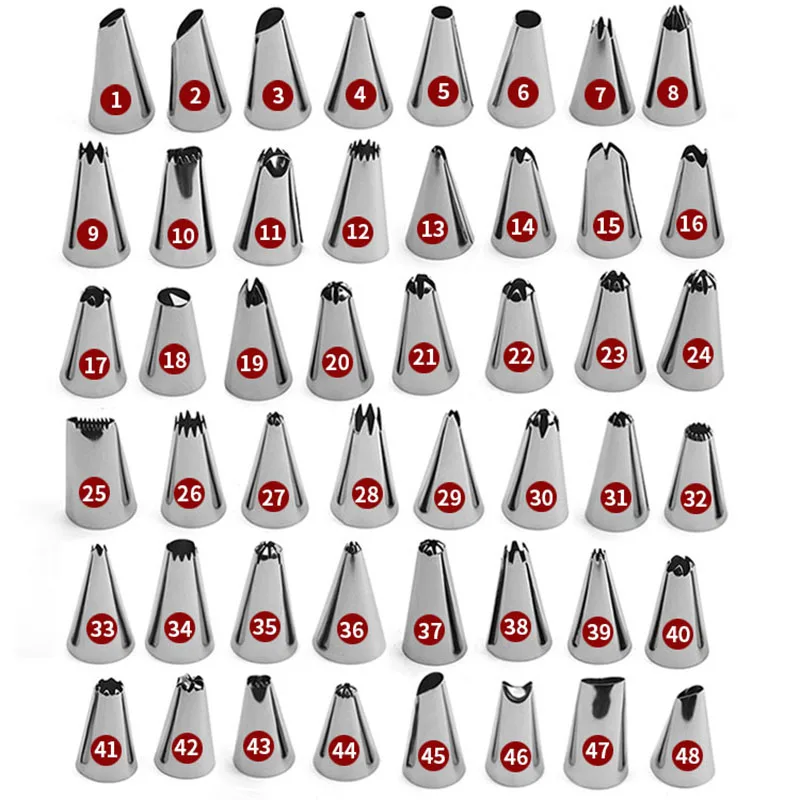 ① 48 × насадки из нержавеющей стали② 1 × силиконовый кондитерский мешок③ 1 × конвертер
