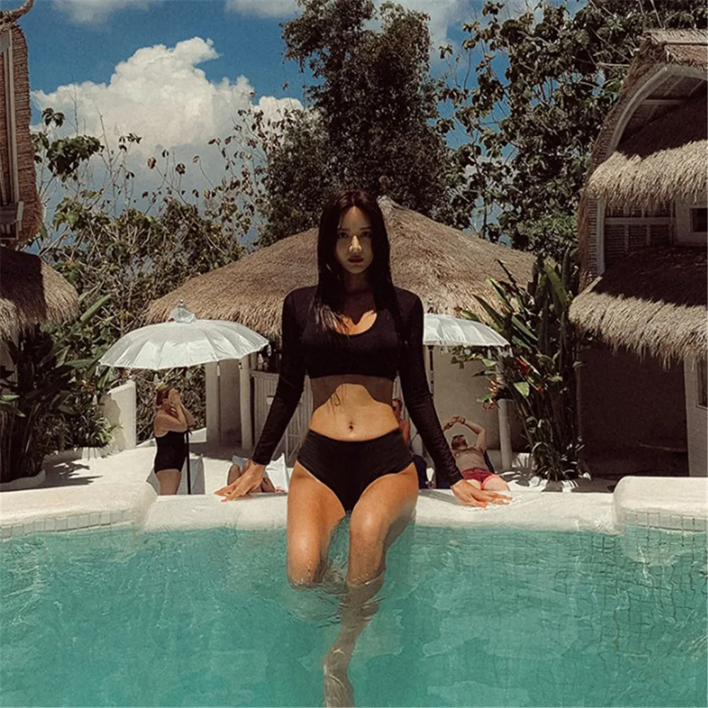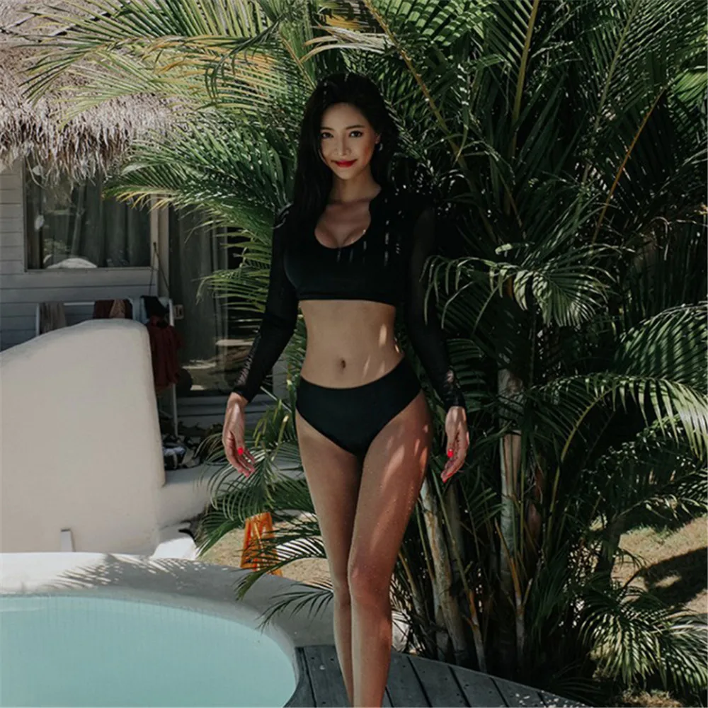 Раздельный женский купальник с длинным рукавом, сетчатый купальник, бикини пуш-ап, танкини, костюм для серфинга, черный купальный костюм
