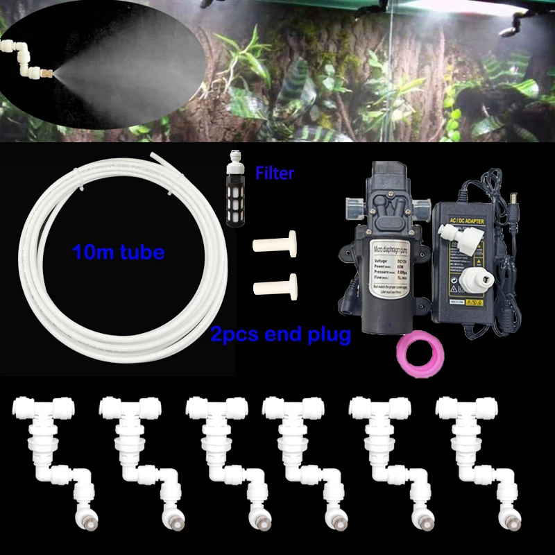1 шт 10 м трубы 1 шт. 5л/мин насос; 1 шт. источник питания; 1xpcs фильтр для воды 2x шт белые разъемы; 2x ps торцевые вилки; 6x шт 1-Head рептилия противотуманные насадки