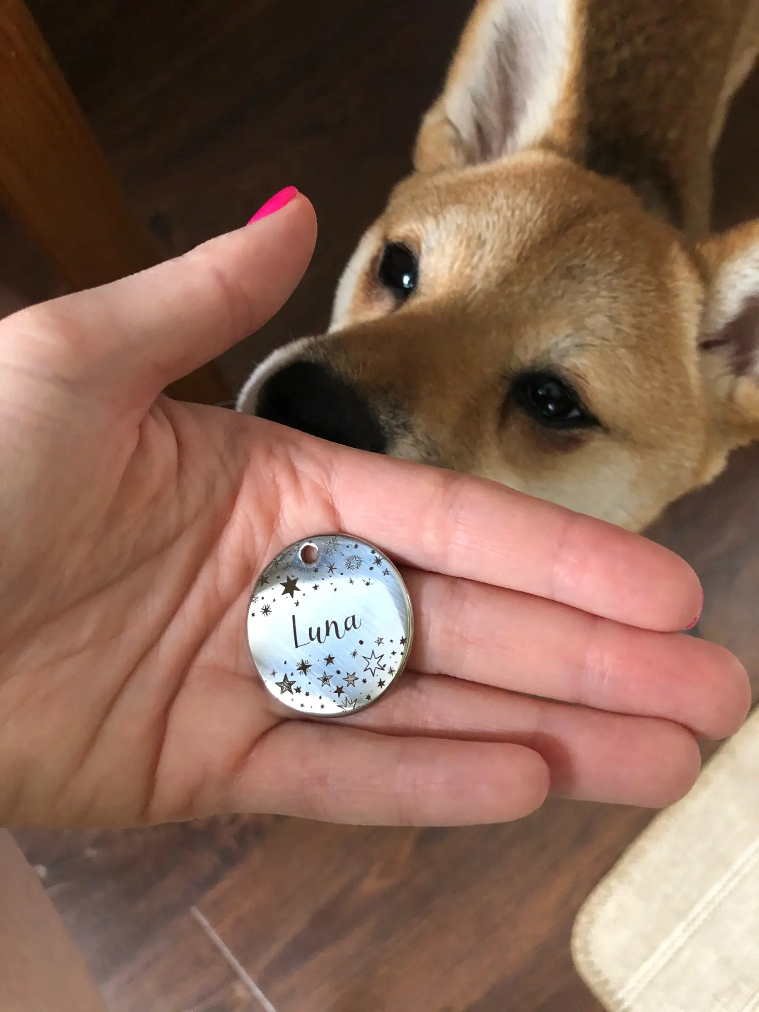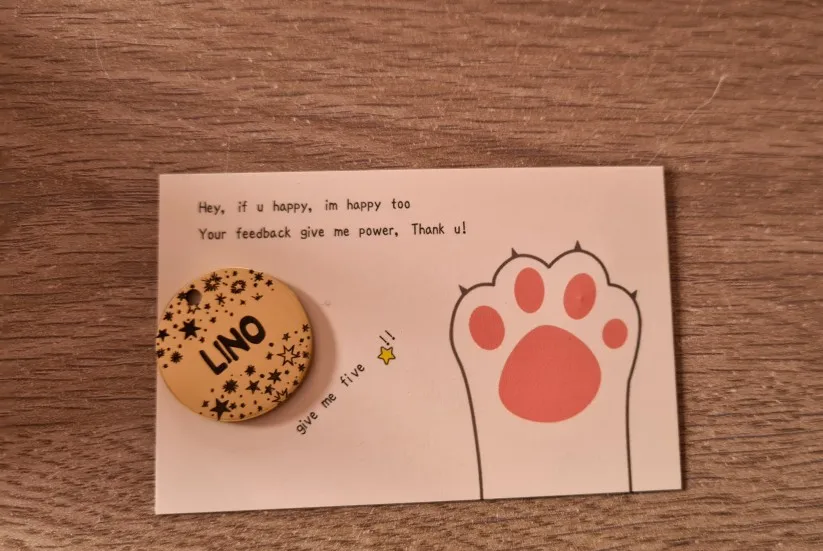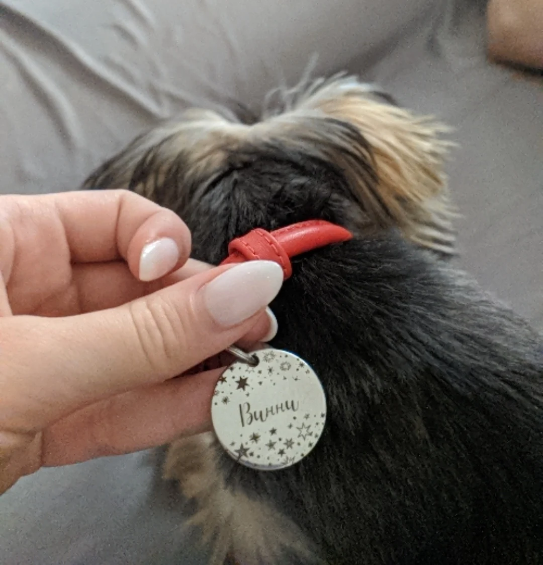 Piękny produkt, ładnie się błyszczy, wszystko jest w porządku. Dodatkowo w gratisie jest dzwoneczek w kształcie pieska. Z tylu mieszczą się 3 numeru telefonów. Wszystko bezpiecznie zapakowane, dostawa w 10 dni.