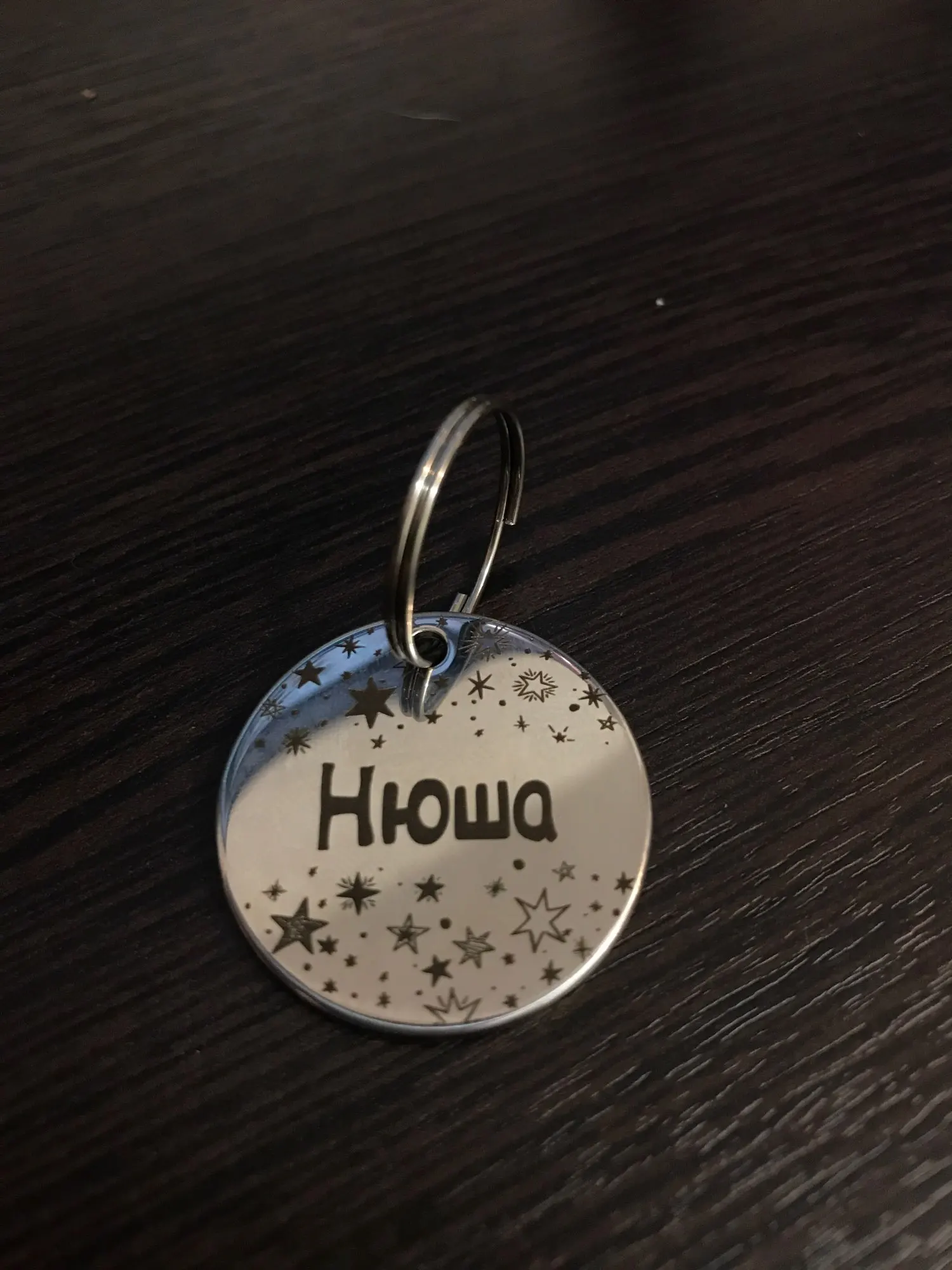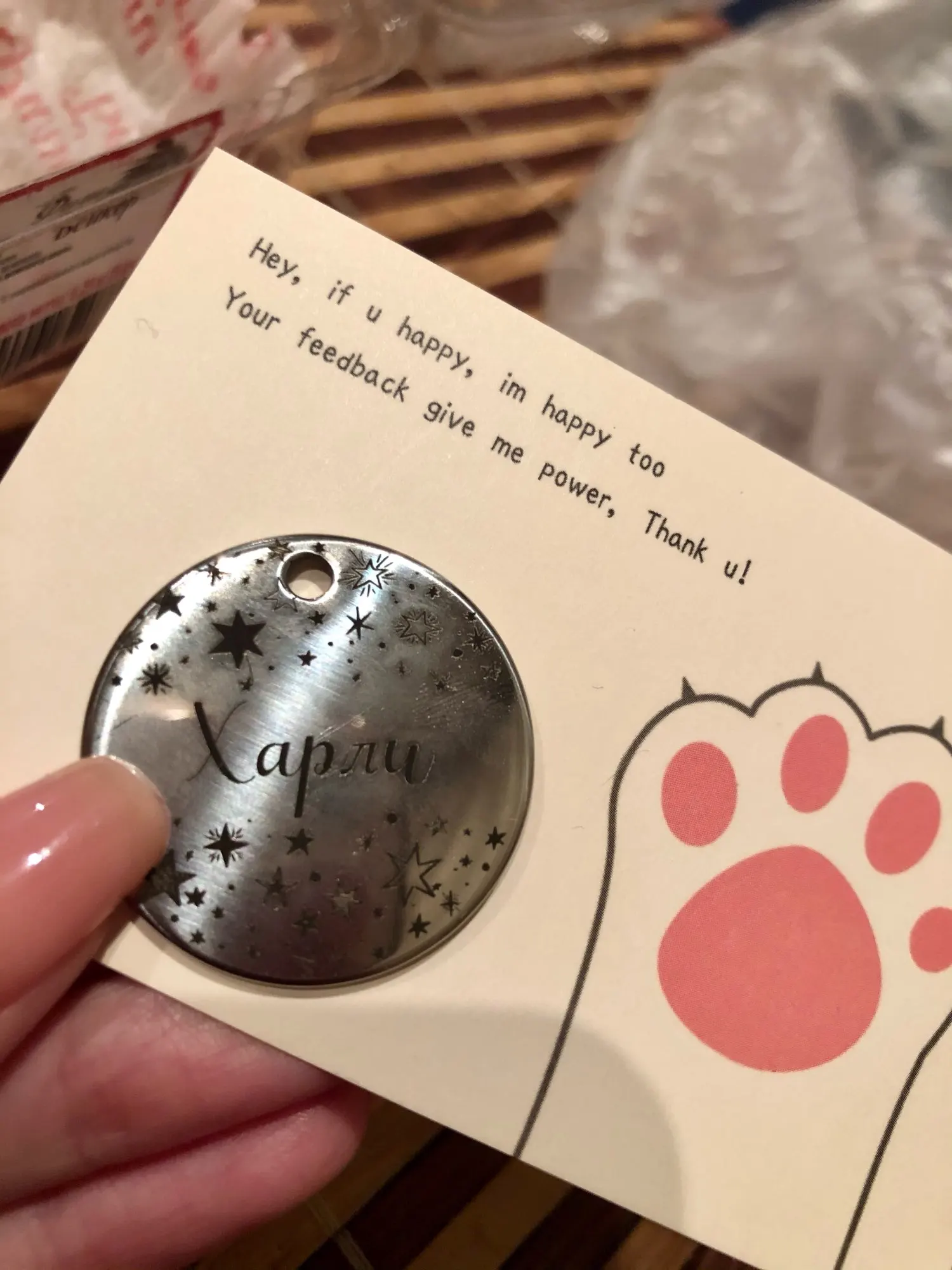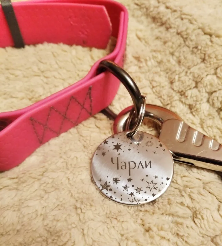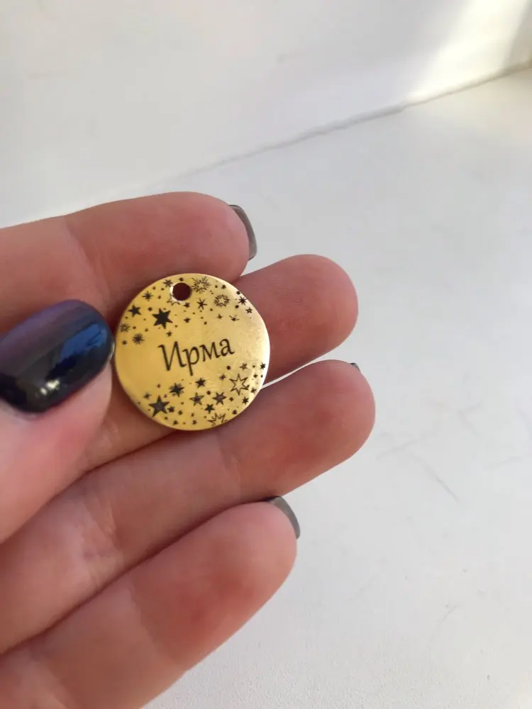 Супер!!! Изготовлено и отправлено быстро, упаковано аккуратно, качество отличное, ошибок нет!!! В посылке дополнительные колечки для крепления жетона и сюрприз - колокольчик))) Очень приятно! Продавца однозначно рекомендую!!!
