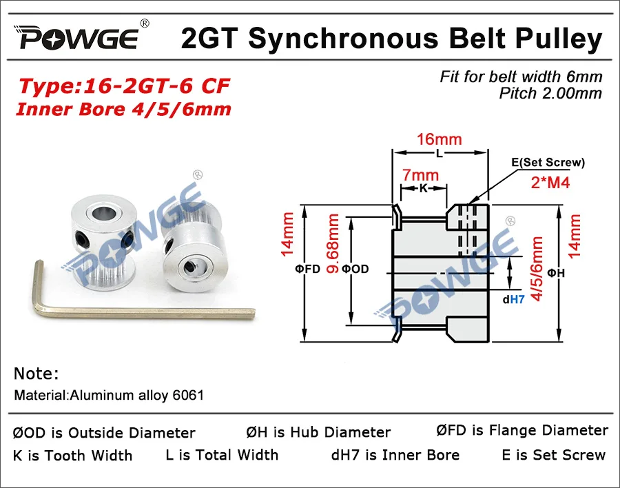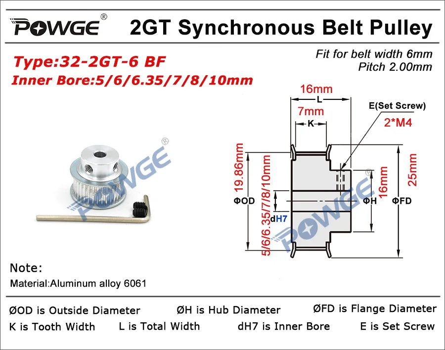 Тип: 16-2GT-6CFВысота: 2 ммКоличество зубов: 16 зубовНаружный диаметр (OD): 9,68 ммДиаметр: 4/5/6 ммФланец: двойнойМатериал: алюминиевый сплавФиксированный режим: 2 * M4Подходит для ширины ремня: 6 мм 32 зубья 2GT шкив ГРМ чертеж: Тип: 32-2GT-6BFВысота: 2 ммКоличество зубов: 32 ЗубьевНаружный диаметр (OD): 19,86 ммДиаметр отверстия: 5/6/6.35/8 ммФланец: двойнойМатериал: алюминиевый сплавФиксированный режим: 2 * M4Подходит для ширины ремня: 6 мм