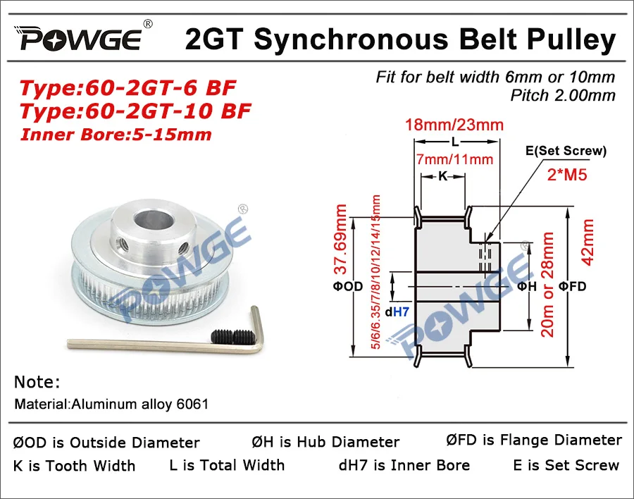 Синхронный зубчатый шкив POWGE 2M2GT, 20 зубьев, 60 зубьев, отверст...