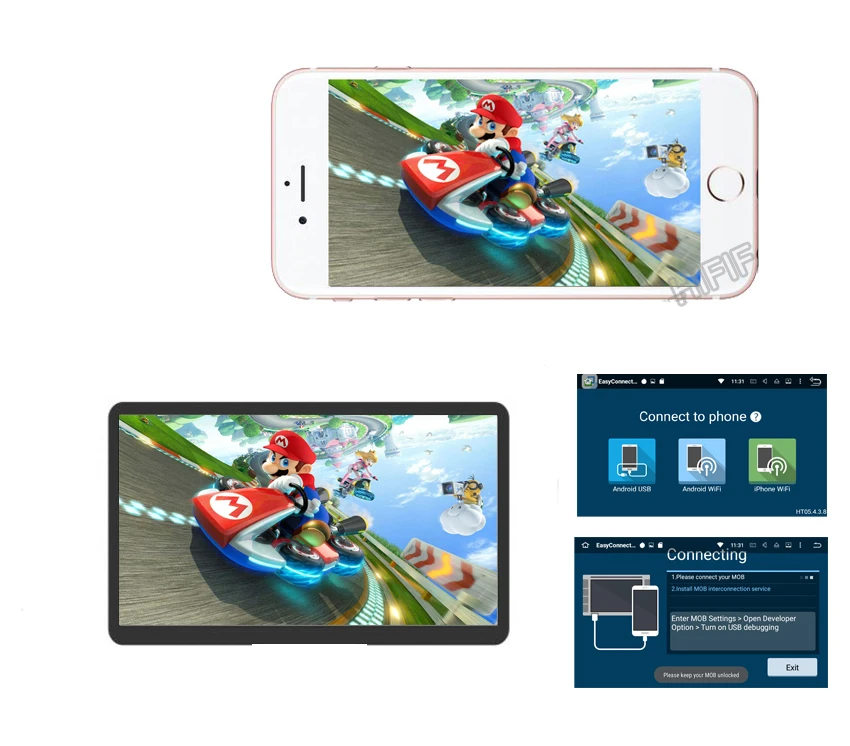 Для Iphone Используйте подключение Wi-Fi, вы можете зеркало устройства, но не можете контролировать.