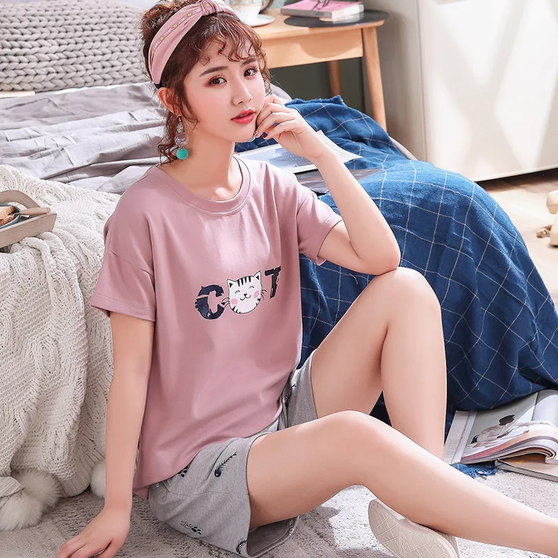 Пижамный комплект женский с коротким рукавом, 100% хлопок, повседневные шорты, футболка, одежда для сна, ночное белье